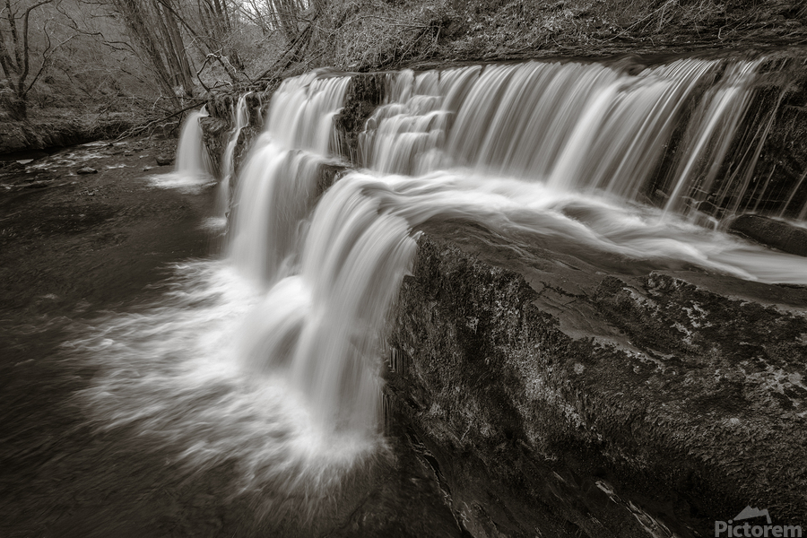 A warm-toned monochrome, long exposure photograph captures the serene beauty of Sgwd Yr Pannwr waterfall as it gracefully tumbles over a rugged rocky ...[+]