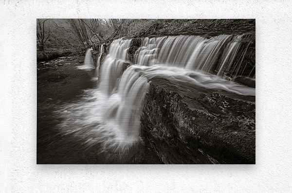 A warm-toned monochrome, long exposure photograph captures the serene beauty of Sgwd Yr Pannwr waterfall as it gracefully tumbles over a rugged rocky ledge into a tranquil stream below. Also referred to as Fall of the Fuller, this picturesque cascade is nestled along the Afon Mellte river in the breathtaking landscape of the Brecon Beacons, South Wales.