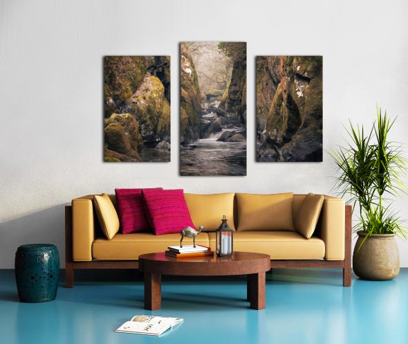 A captivating photograph of the majestic Fairy Glen in North Wales near Betws-y-Coed. This serene nature scene showcases unique rock formations framing a tranquil river as it meanders through a narrow, misty gorge. The image captures the peaceful and solitary beauty of this hidden gem, perfect for nature enthusiasts and those seeking a sense of calm and solitude.