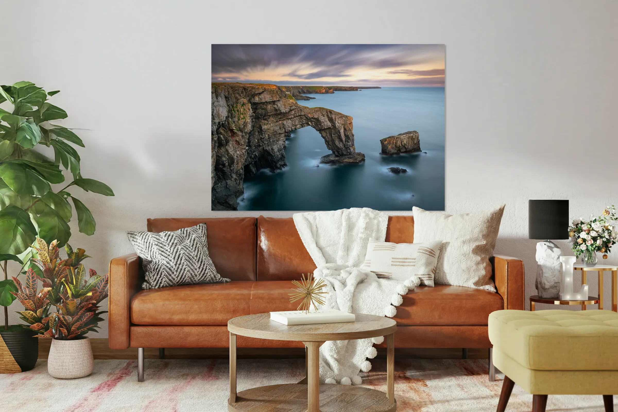 A long exposure photograph of the Green Bridge of Wales at sunset showcasing a natural arch formed from Carboniferous Limestone. Located within the Pembrokeshire Coast National Park in Pembrokeshire Wales this image captures the serene beauty of the coastal landscape highlighting the dramatic geological features and vibrant colors of the sunset sky. Perfect for those interested in nature photography coastal scenery and the unique rock formations of Wales.