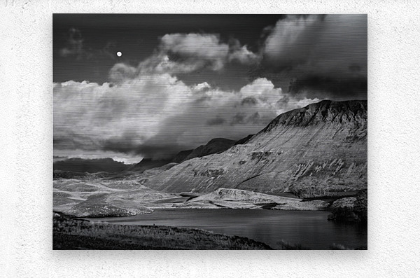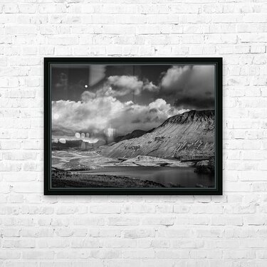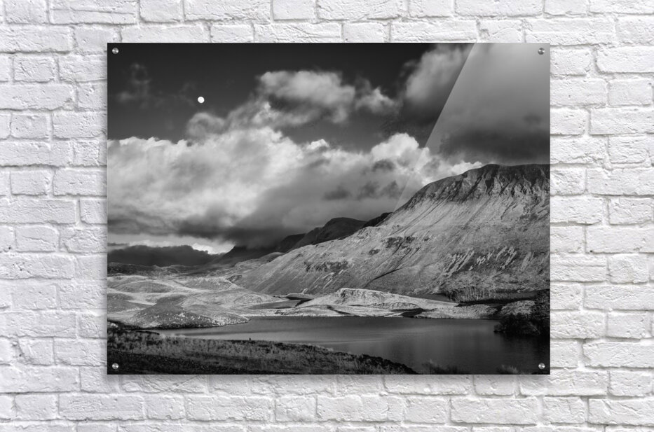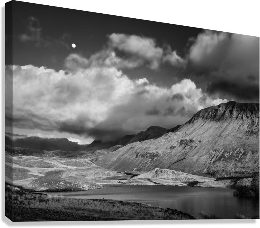 A monochrome photograph of the moon rising above clouds over Llynnau Cregennen in Gwynedd North Wales. This beautiful landscape scenery features clouds drifting over the mountains creating a calm and peaceful atmosphere. The serene waters of the lake and the dramatic sky capture the essence of North Wales natural beauty offering a tranquil and timeless view. Perfect for those who appreciate nature photography and the enchanting landscapes of Wales.