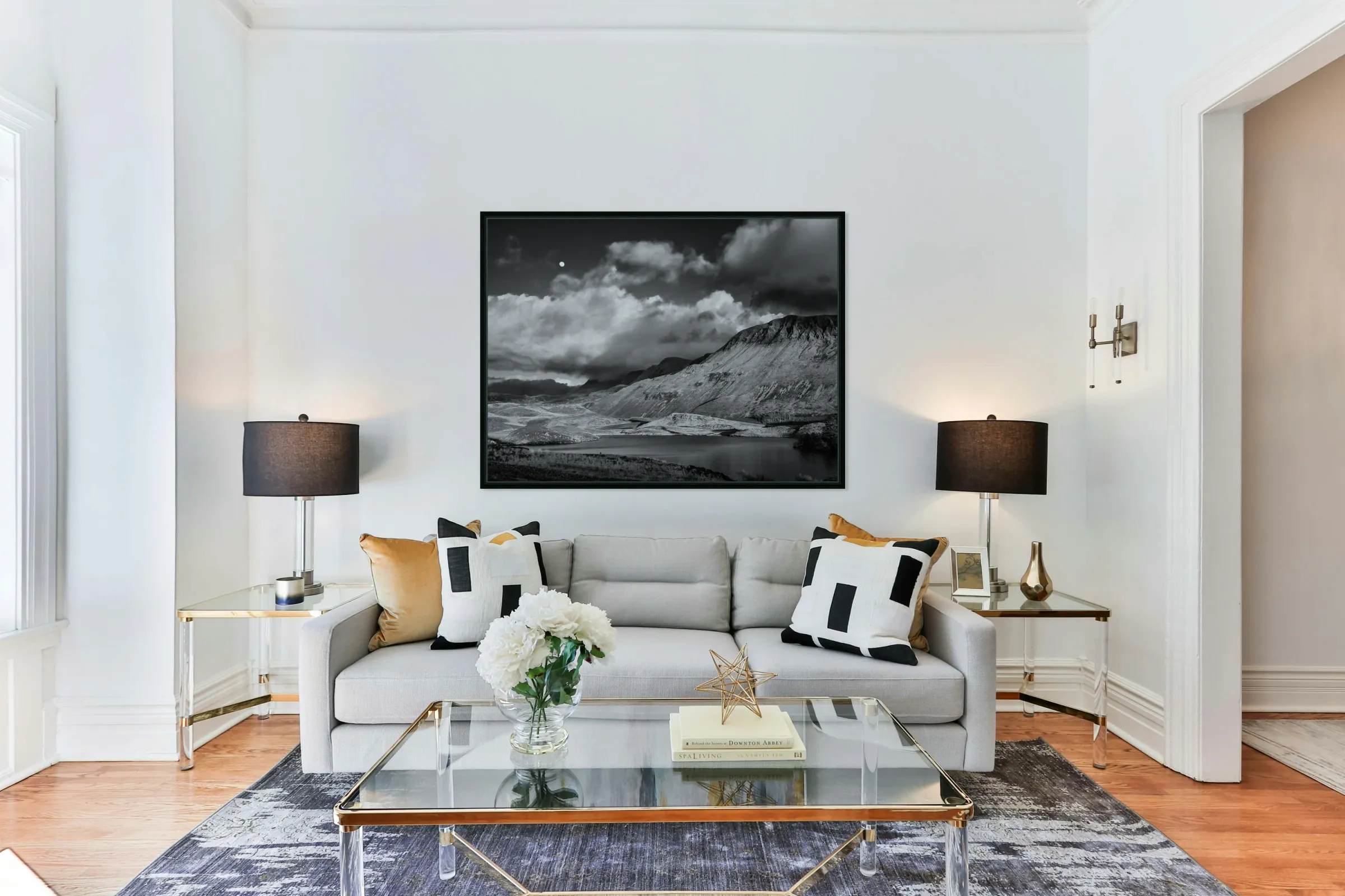 A monochrome photograph of the moon rising above clouds over Llynnau Cregennen in Gwynedd North Wales. This beautiful landscape scenery features clouds drifting over the mountains creating a calm and peaceful atmosphere. The serene waters of the lake and the dramatic sky capture the essence of North Wales natural beauty offering a tranquil and timeless view. Perfect for those who appreciate nature photography and the enchanting landscapes of Wales.