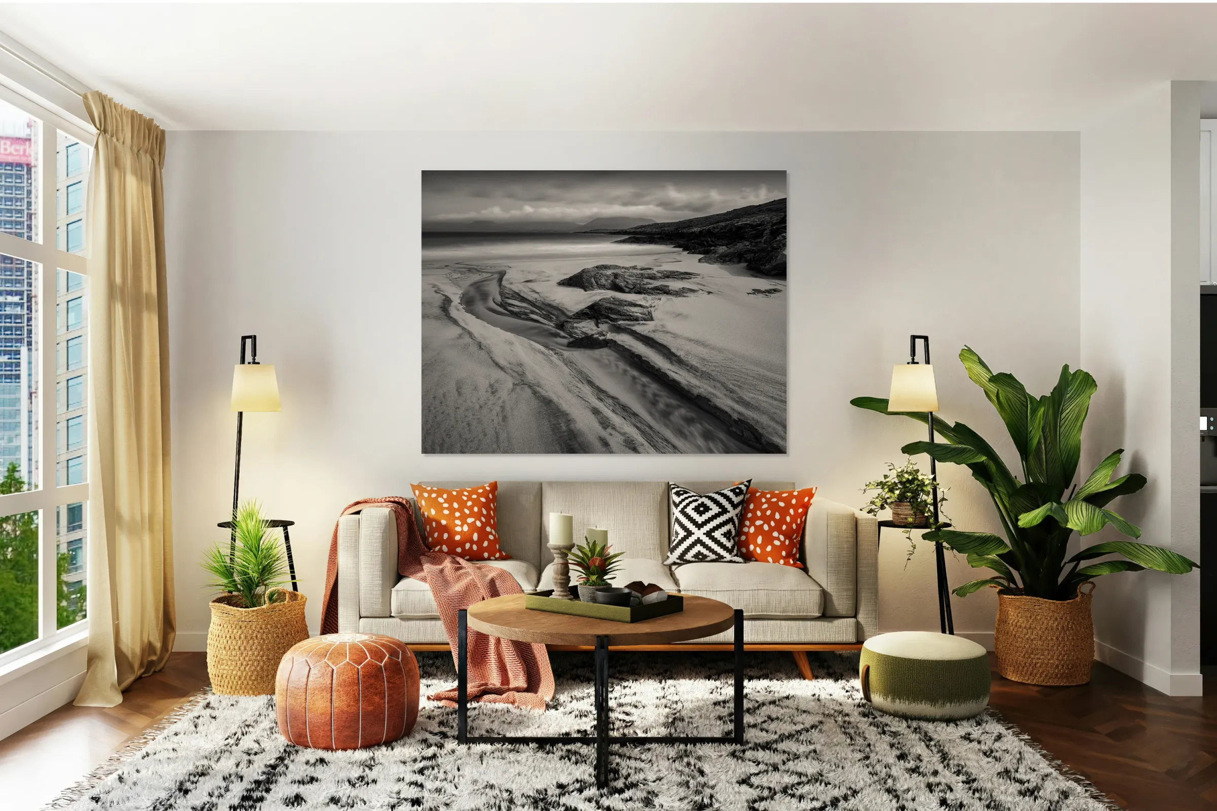 A monochrome photograph of a small flowing stream carving its path down Luskentyre Beach towards the sea. In the background gentle hills gradually disappear into the misty horizon under a cloudy sky. Captured on the Isle of Harris in the Outer Hebrides Scotland this image showcases the serene landscape and natural beauty of the region. The black and white tones highlight the textures and contrasts of the beach and surrounding environment creating a timeless and tranquil scene.