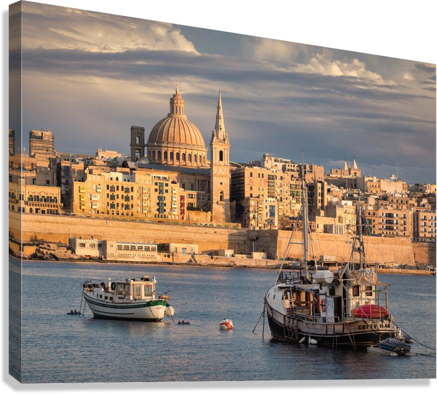 The serene waterfront of the old town of Valletta in Malta with two boats in the foreground and the city bathed in the last of the days sunlight. In the background is the famous domed roof of the Basilica of Our Lady of Mount Carmel.