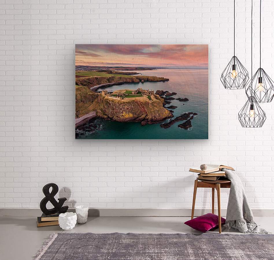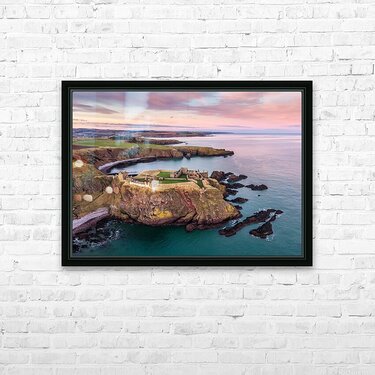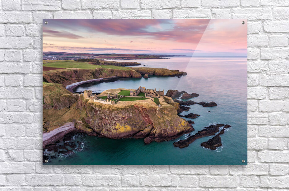 A breathtaking aerial view of Dunnottar Castle set against the pink skies of a stunning sunset in Aberdeenshire Scotland. This photograph captures the...[+]