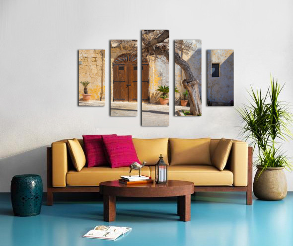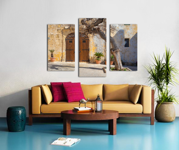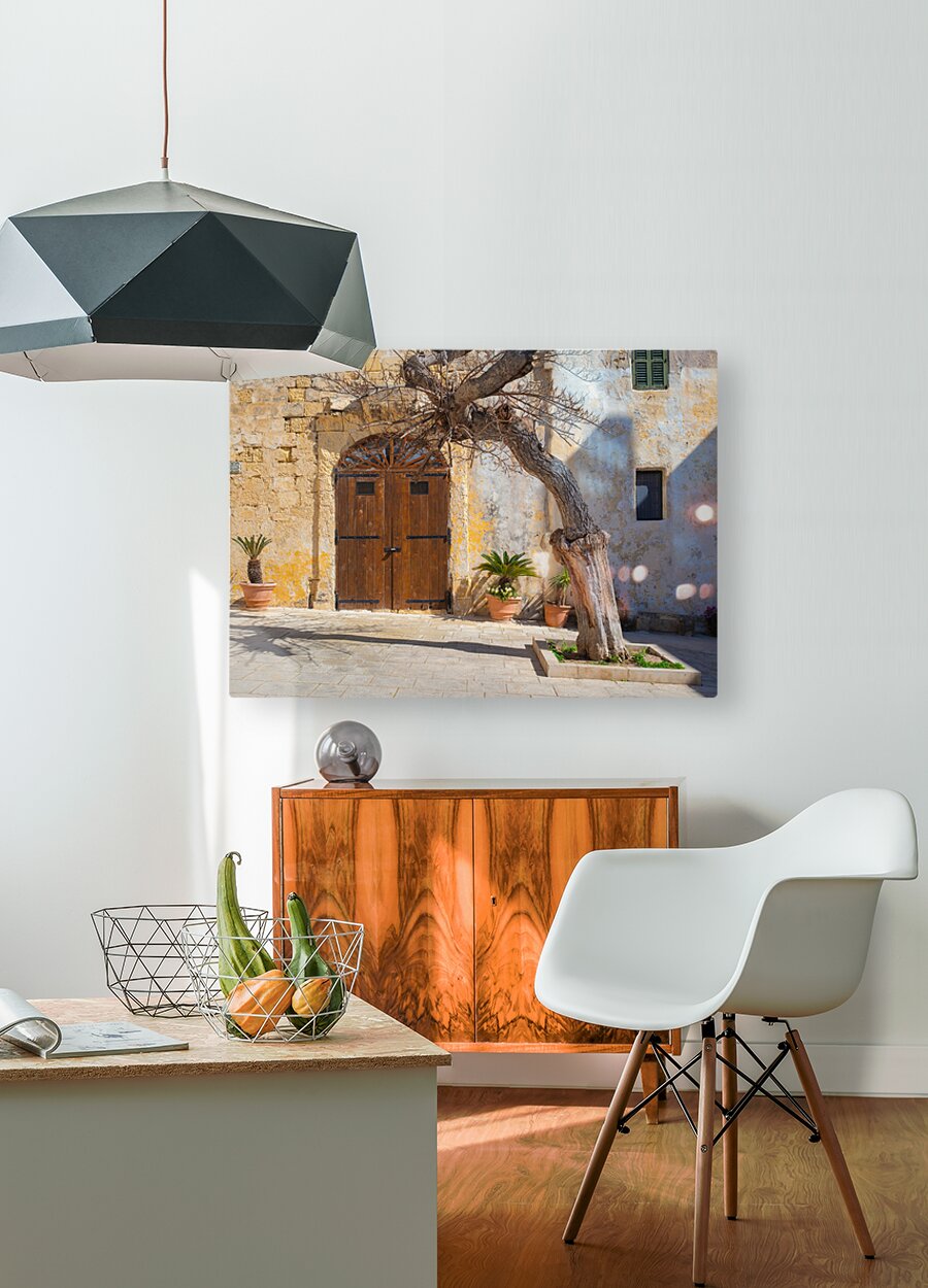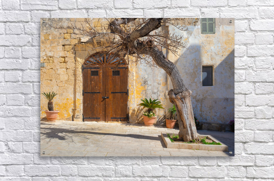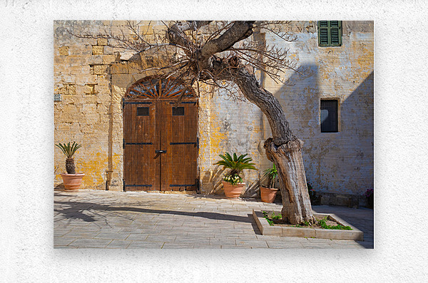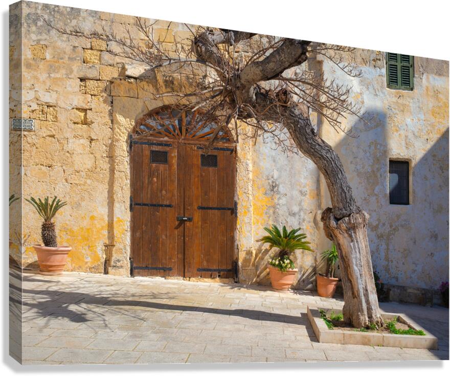 A gnarled tree stands prominently in front of an old textured wall with a rustic wooden door in Pjazza Mesquita Mesquita Square located in the ancient city of Mdina Malta. The historic architecture and the natural beauty of the twisted tree create a picturesque scene capturing the timeless charm and character of Mdina. This photograph highlights the unique combination of natural and architectural elements found in this historic Maltese square.