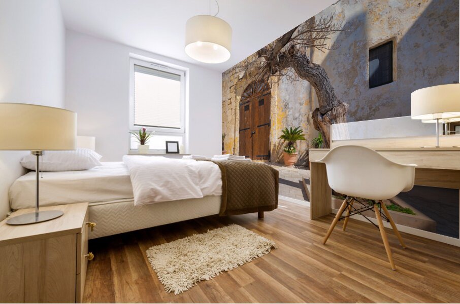 A gnarled tree stands prominently in front of an old textured wall with a rustic wooden door in Pjazza Mesquita Mesquita Square located in the ancient...[+]