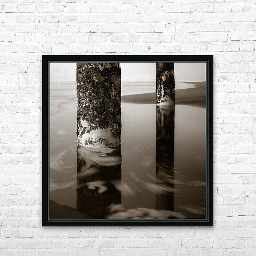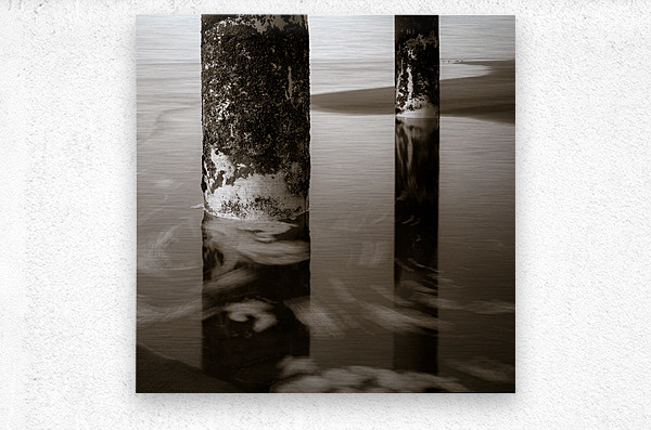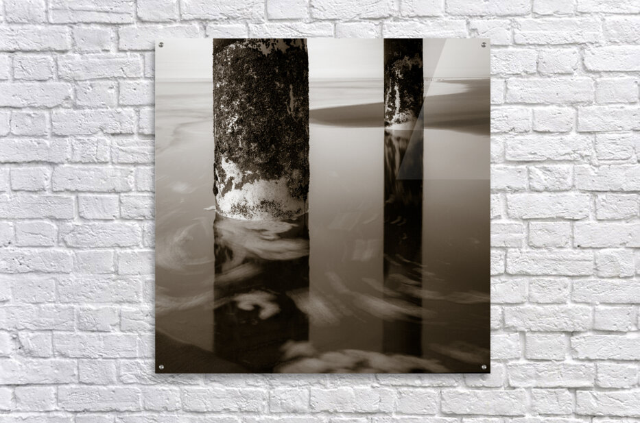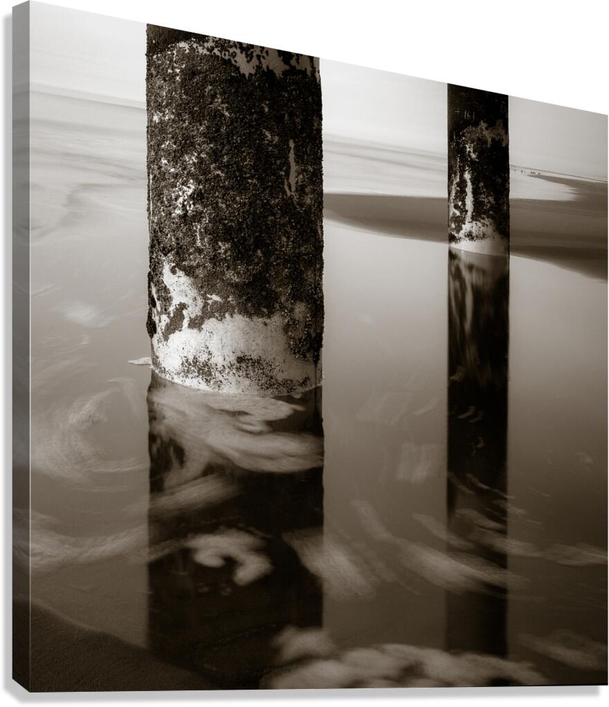 A semi-abstract monochrome photograph capturing the supporting pillars beneath Scheveningen Pier in the Netherlands with sea foam swirling around them. This artistic image highlights the intricate structure of the piers columns and the dynamic movement of the oceans surf creating a striking contrast between the solid pillars and the fluid sea. Ideal for those seeking unique coastal-themed art that emphasizes the interplay between man-made and natural elements.