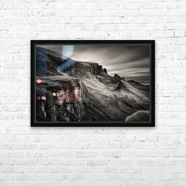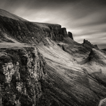 This moody, monochrome photograph captures the Quiraing on the Isle of Skye in the Inner Hebrides, Scotland. Rugged peaks and sweeping valleys dominat...[+]
