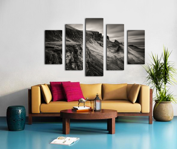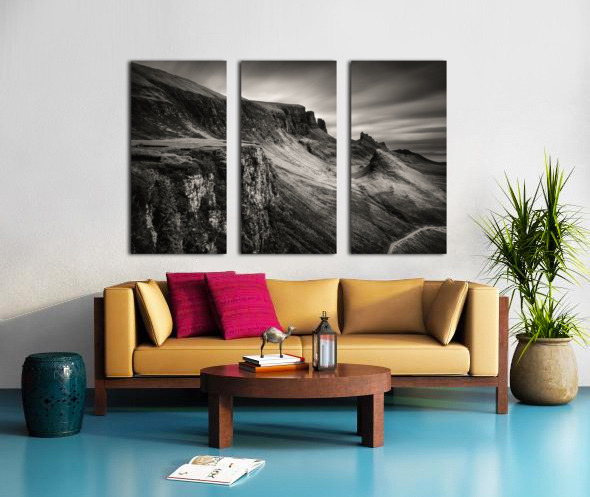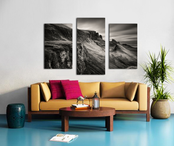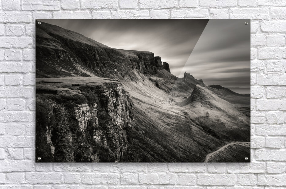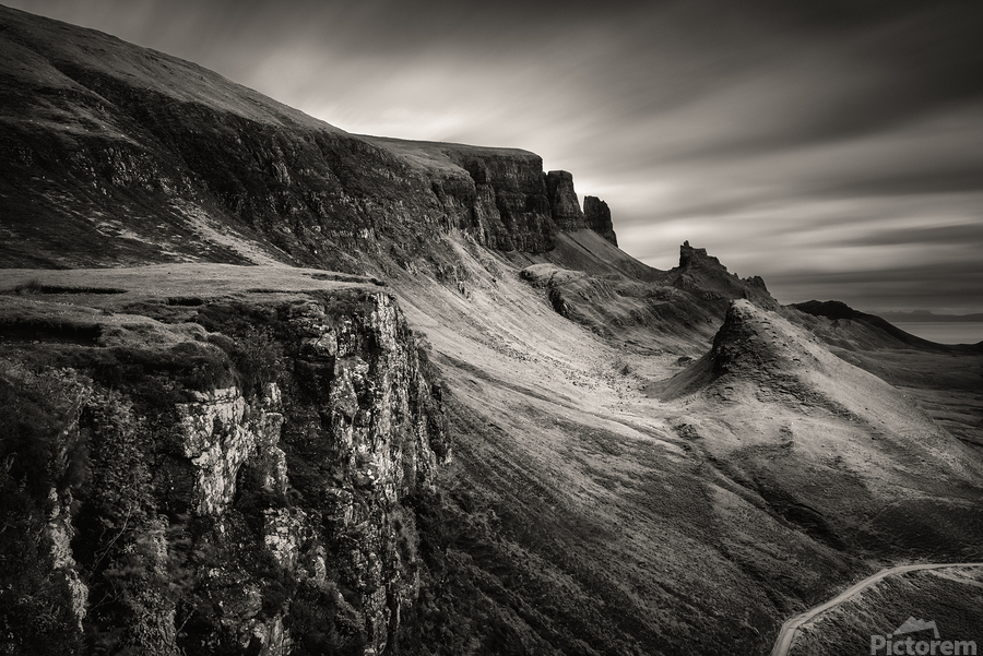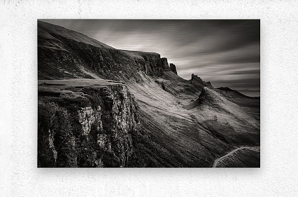 This moody, monochrome photograph captures the Quiraing on the Isle of Skye in the Inner Hebrides, Scotland. Rugged peaks and sweeping valleys dominate the scene, while the long exposure creates smooth, ethereal clouds, enhancing the sense of scale and atmosphere in this dramatic landscape. The Quiraing is one of Scotland’s most iconic geological formations, part of the Trotternish Ridge. Its jagged cliffs and distinctive landforms have long drawn visitors and photographers, offering a striking example of the natural beauty and raw character of the Highlands. This image is perfect for anyone who appreciates dramatic landscapes, rugged mountain scenery, or the stark beauty of the Scottish Highlands. It is available as wall art and across a wide range of formats to suit your space or style.