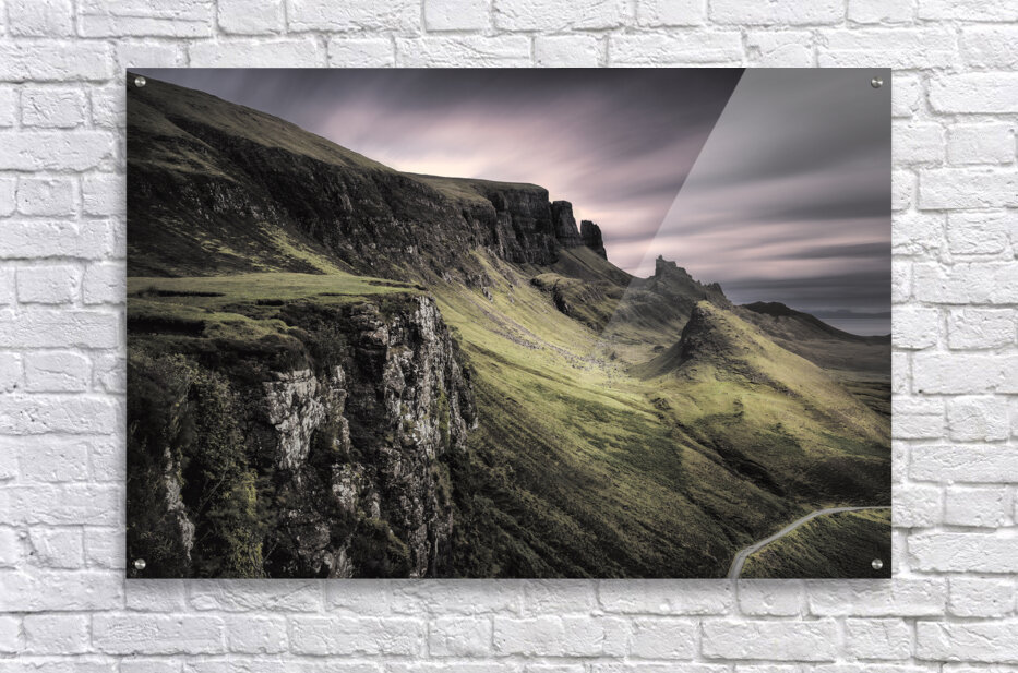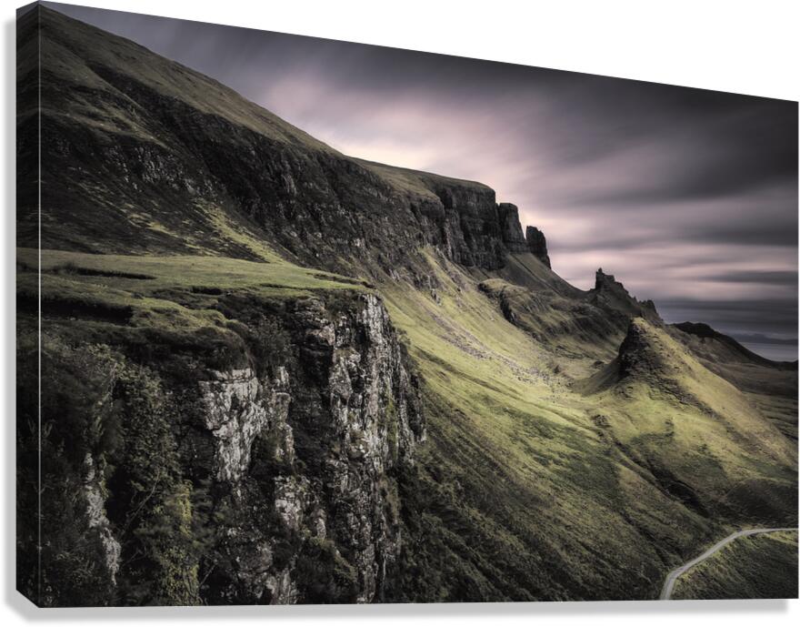A moody long exposure view of the Quiraing on the Isle of Skye Inner Hebrides Scotland. This atmospheric photograph captures the dramatic landscape of the Quiraing with its rugged terrain and eerie cliffs. The long exposure technique enhances the brooding sky and smooths the movement of clouds creating a surreal and captivating scene. Ideal for those seeking a photographic representation of Scotlands wild and mysterious beauty this image showcases the unique geological formations and haunting ambiance of the Quiraing.