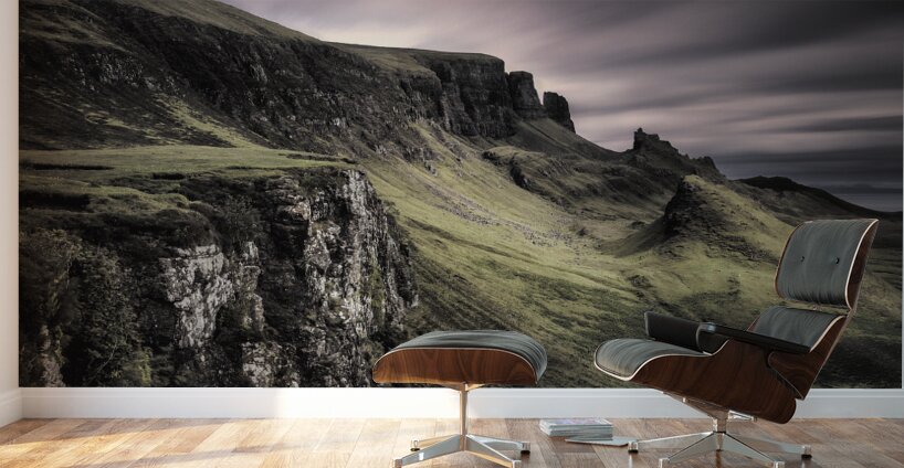 A moody long exposure view of the Quiraing on the Isle of Skye Inner Hebrides Scotland. This atmospheric photograph captures the dramatic landscape of the Quiraing with its rugged terrain and eerie cliffs. The long exposure technique enhances the brooding sky and smooths the movement of clouds creating a surreal and captivating scene. Ideal for those seeking a photographic representation of Scotlands wild and mysterious beauty this image showcases the unique geological formations and haunting ambiance of the Quiraing.