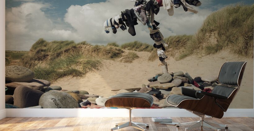 A photograph of Dobbys grave on Freshwater West beach in Pembrokeshire South Wales. The memorial created by fans marks the location where the beloved house elf was killed in Harry Potter and the Deathly Hallows Part 1 one of the most emotional scenes in the film series. The shrine features pebbles with written tributes socks symbolizing Dobbys freedom and a wooden cross similar to the one in the film. This poignant site has become a significant spot for Harry Potter fans visiting the beach.