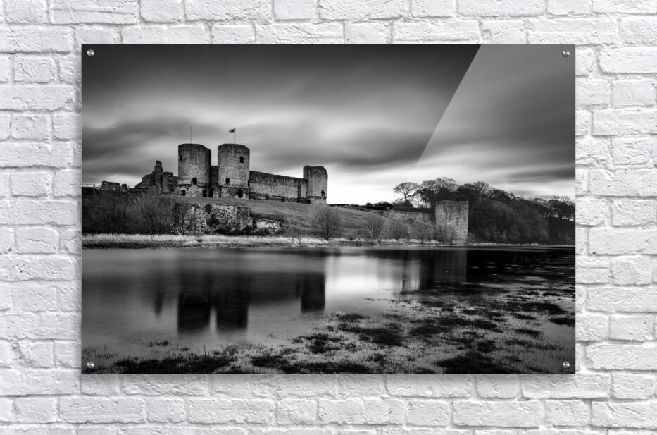 A monochrome long exposure photograph of the ancient and medieval ruins of Rhuddlan Castle reflected in the serene waters of the River Clwyd in Rhuddl...[+]