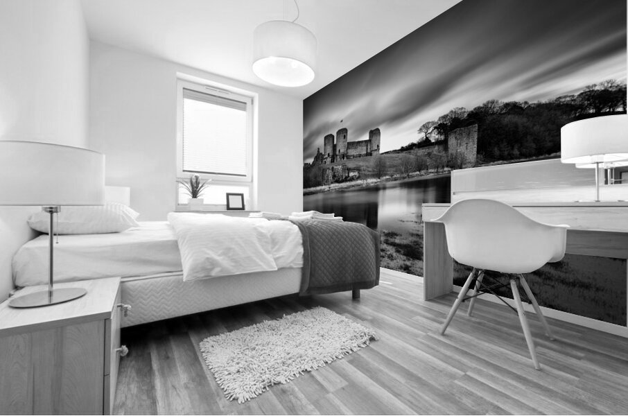 A monochrome long exposure photograph of the ancient and medieval ruins of Rhuddlan Castle reflected in the serene waters of the River Clwyd in Rhuddlan North Wales. This image highlights the historic architecture and tranquil ambiance of Rhuddlan Castle a significant landmark with centuries of history. Perfect for those interested in historic sites medieval architecture and scenic landscapes this photograph offers a timeless view of one of North Wales most iconic castles.