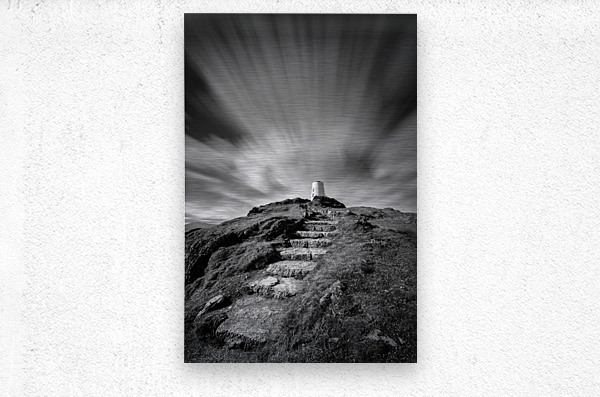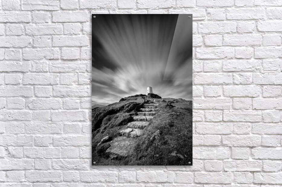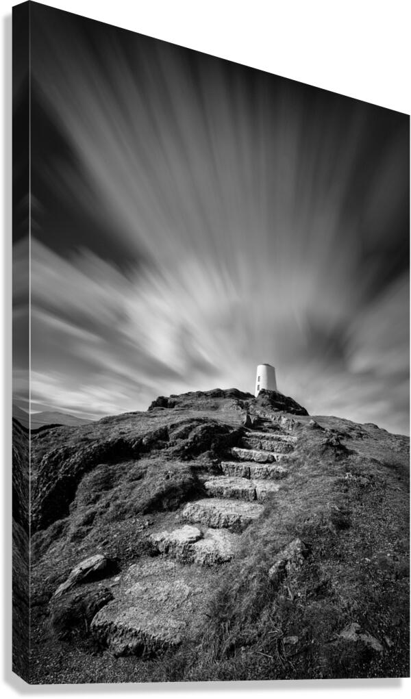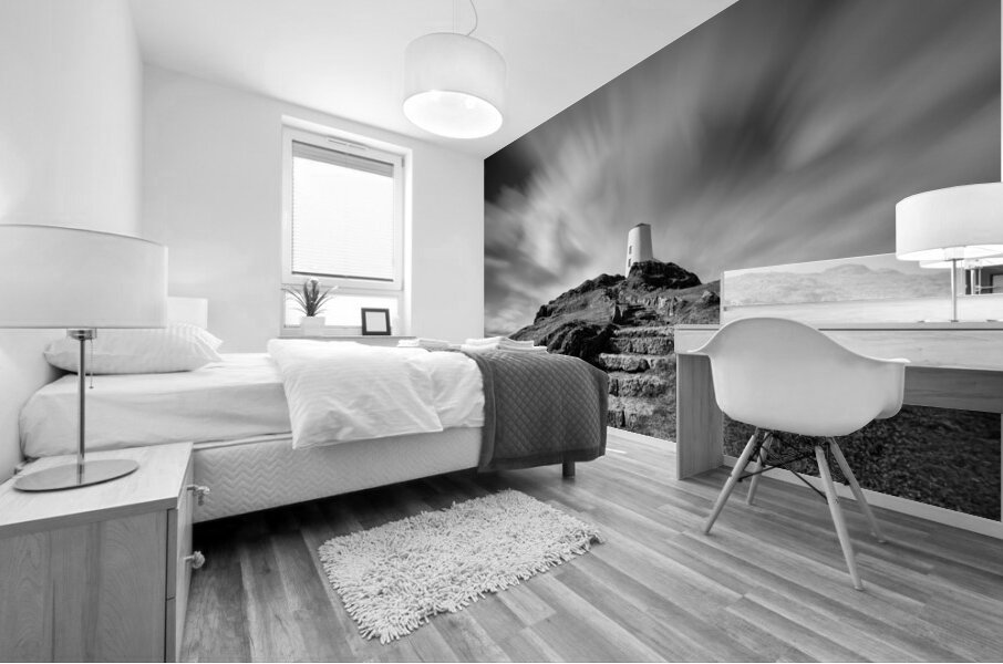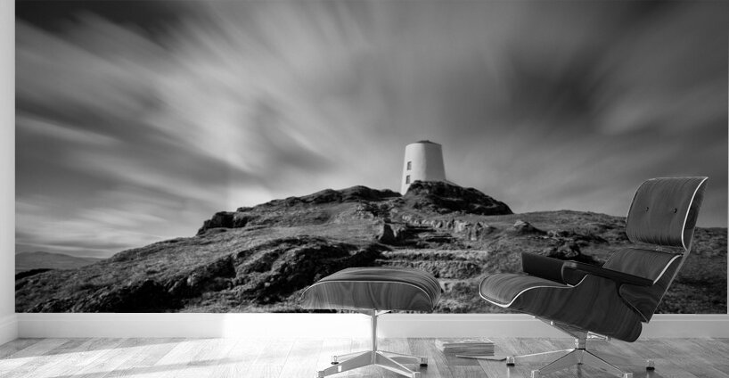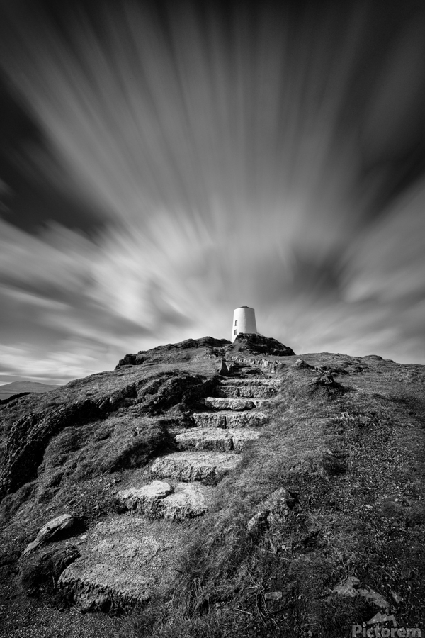 A monochrome long exposure photograph capturing clouds drifting above Twr Mawr Lighthouse on Llanddwyn Island Anglesey North Wales. This atmospheric i...[+]