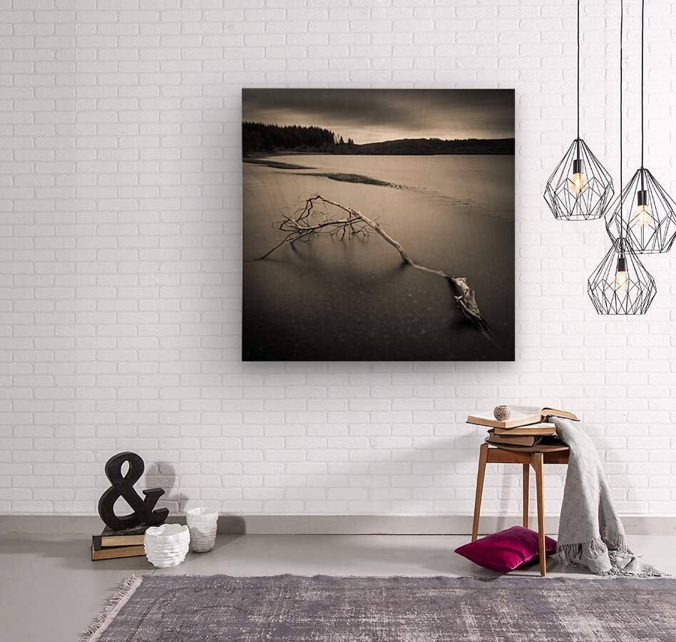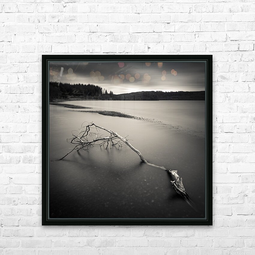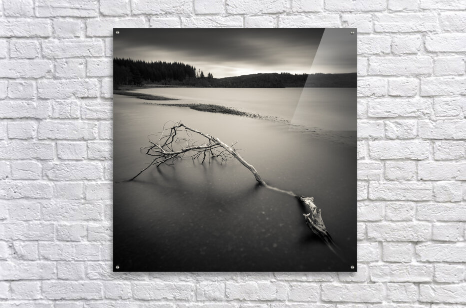 A long exposure monochrome photograph capturing a broken branch amidst the serene waters of Loch Avich Argyll and Bute Scotland. The image evokes an e...[+]
