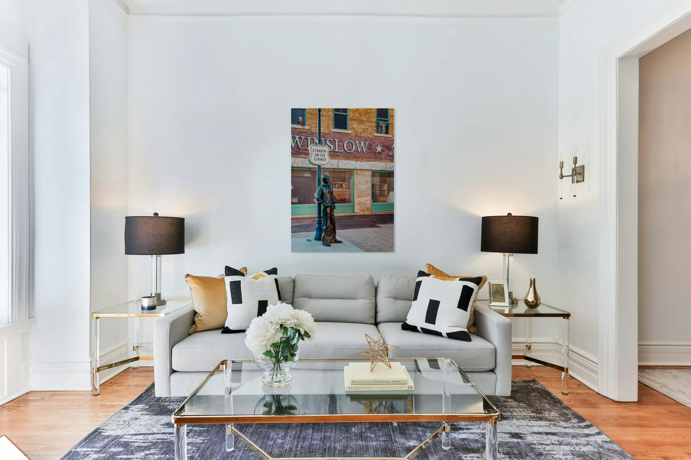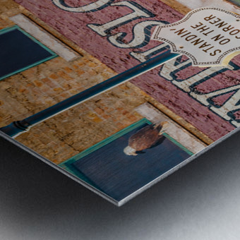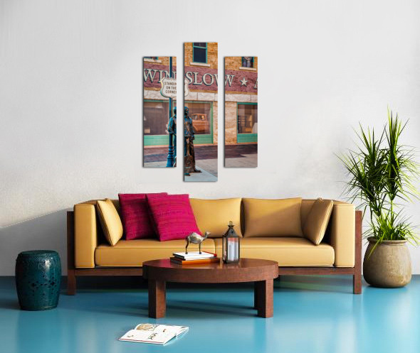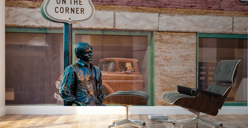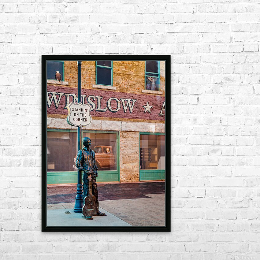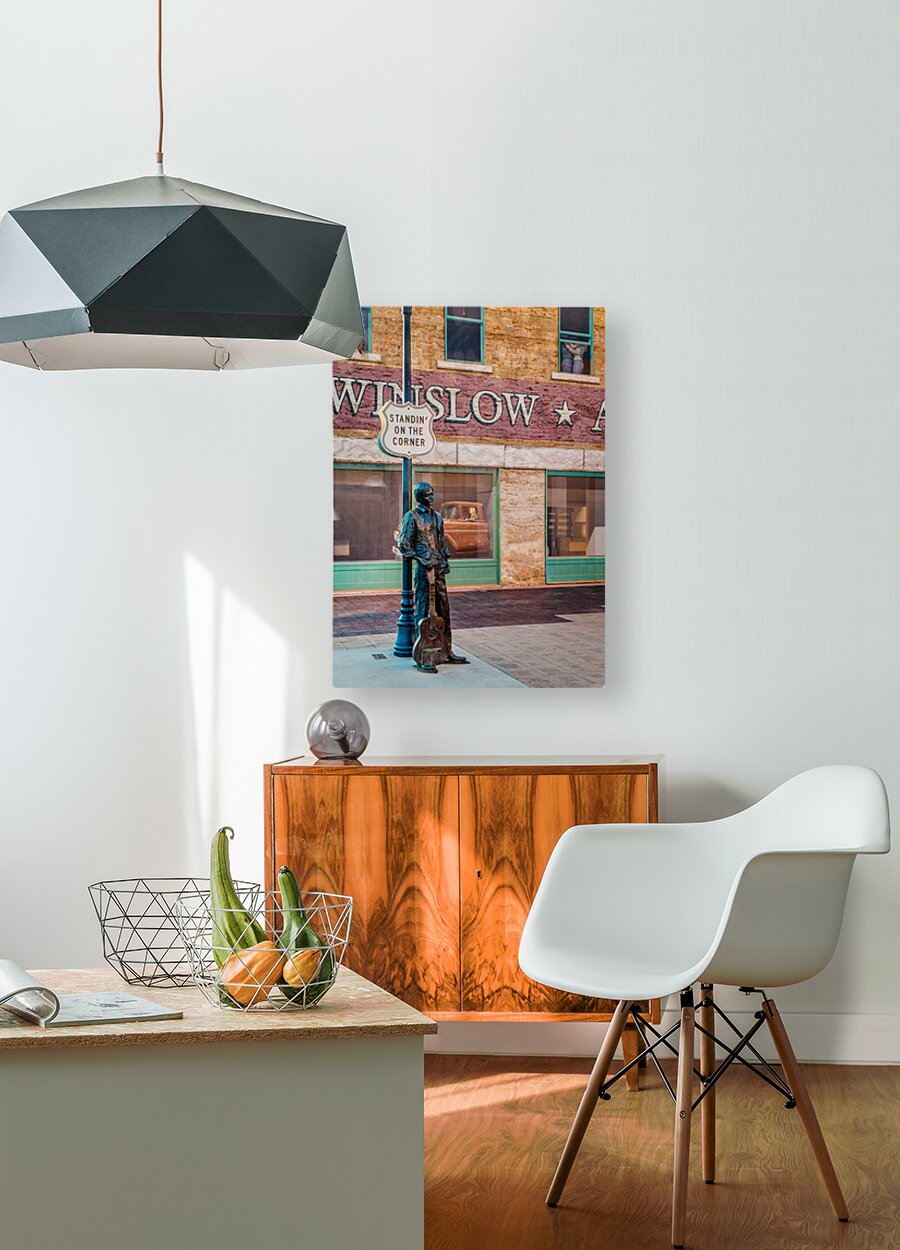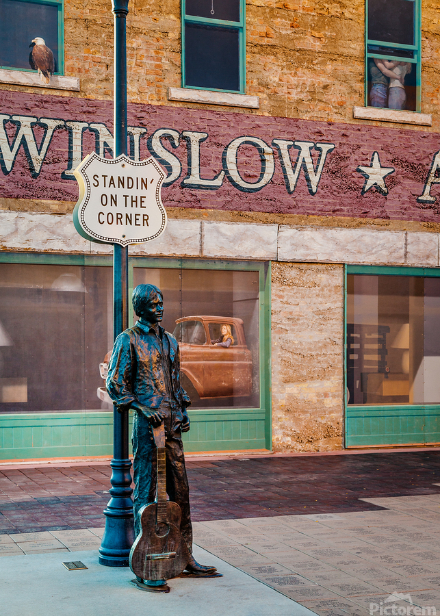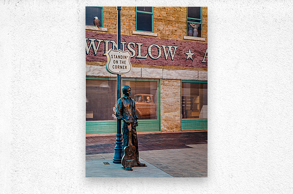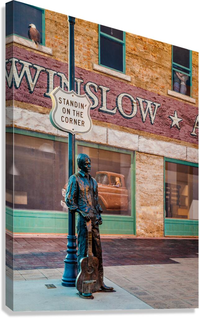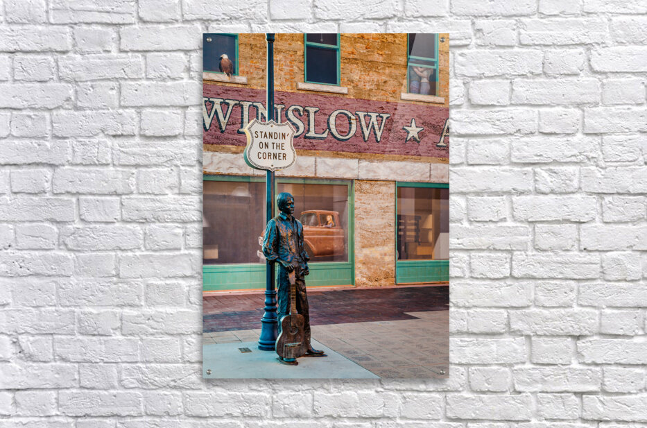 A photograph capturing Ron Adamsons sculpture on the iconic corner in Winslow Arizona immortalized by The Eagles song Take it Easy USA. The image showcases the detailed craftsmanship of the sculpture and the historic significance of this landmark location. Perfect for fans of The Eagles Route 66 enthusiasts and collectors of Americana.