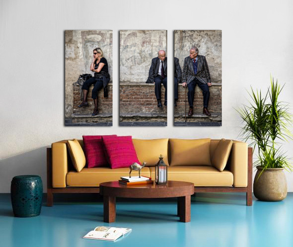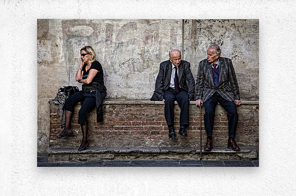 A photograph capturing a juxtaposition of eras in Siena Italy. Two elderly Italian men are seated on one side of a rustic stone wall deeply engaged in...[+]