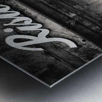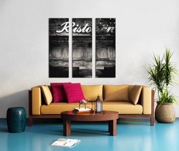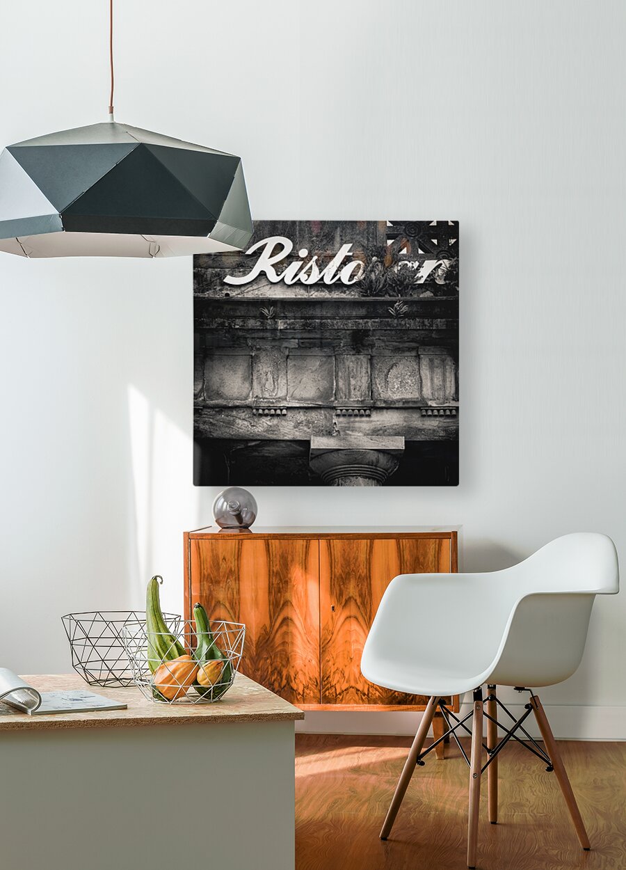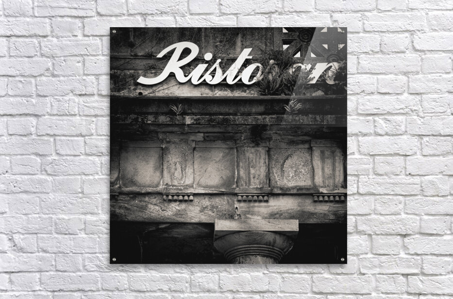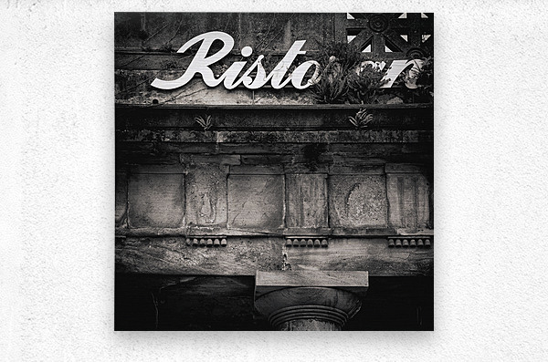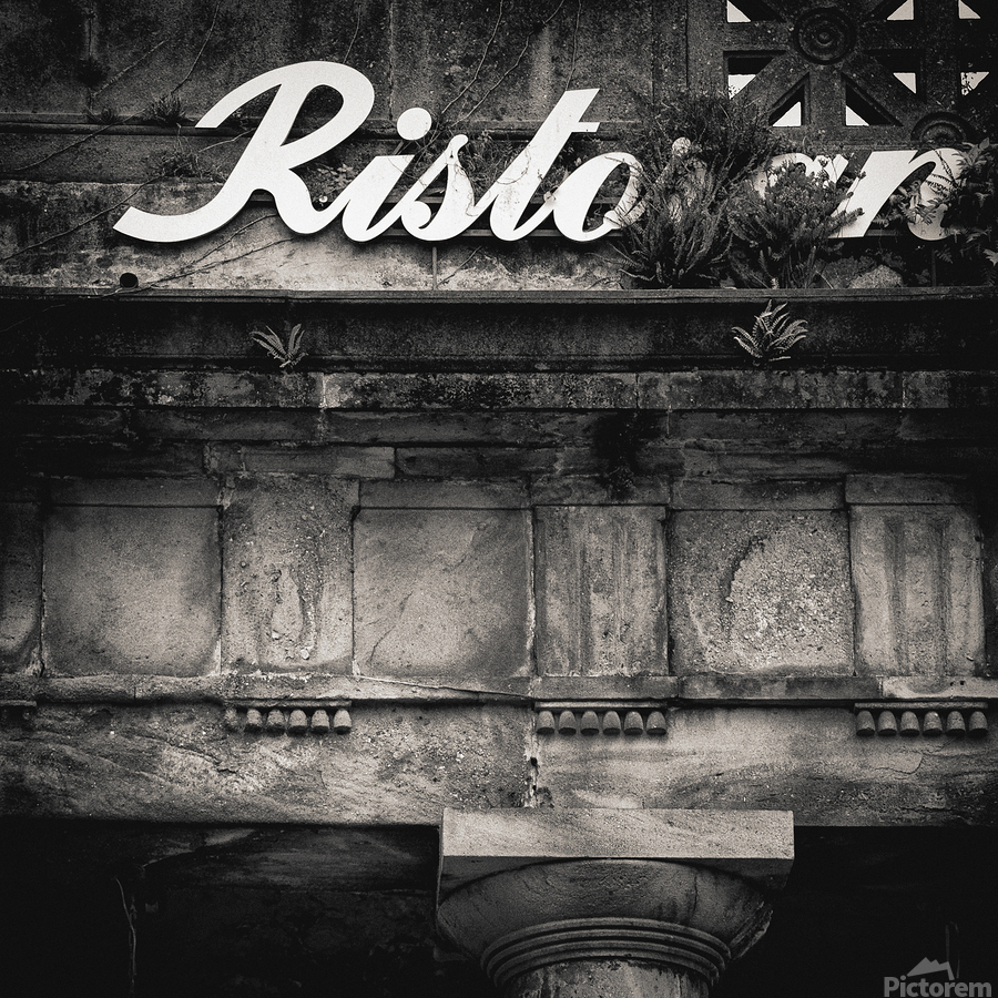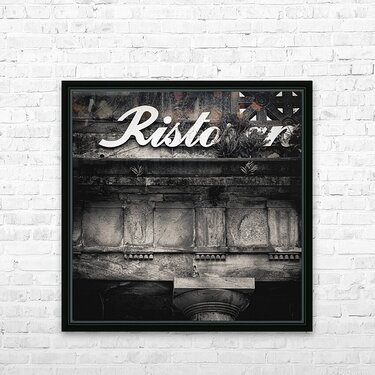 A monochrome warm-toned photograph captures a section of an old and abandoned restaurant on the streets of Lucca Italy. The image highlights a portion...[+]
