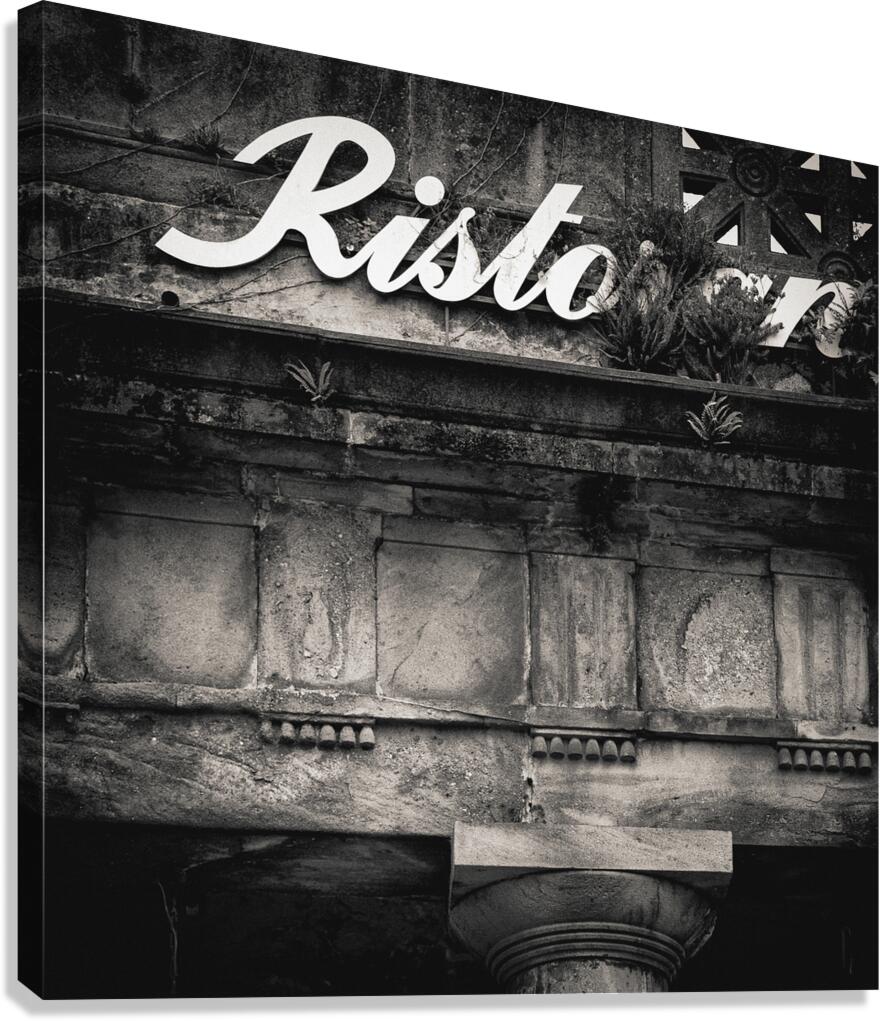 A monochrome warm-toned photograph captures a section of an old and abandoned restaurant on the streets of Lucca Italy. The image highlights a portion of the restaurant sign and the weathered stone walls now becoming overgrown with foliage. Ideal for those interested in Italian street scenes vintage architecture and urban decay photography.