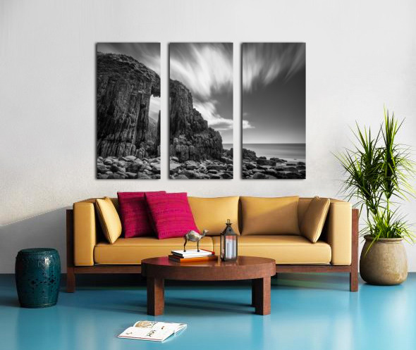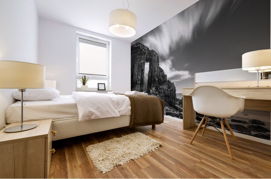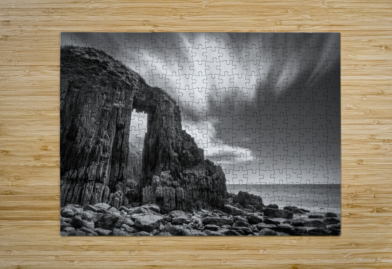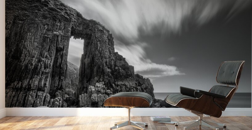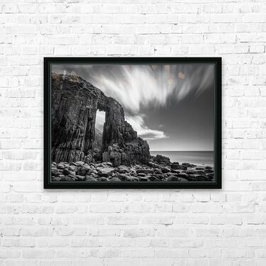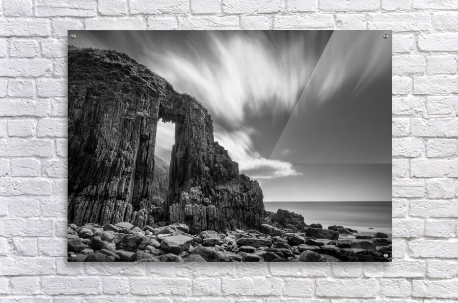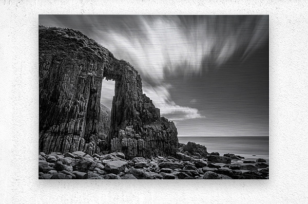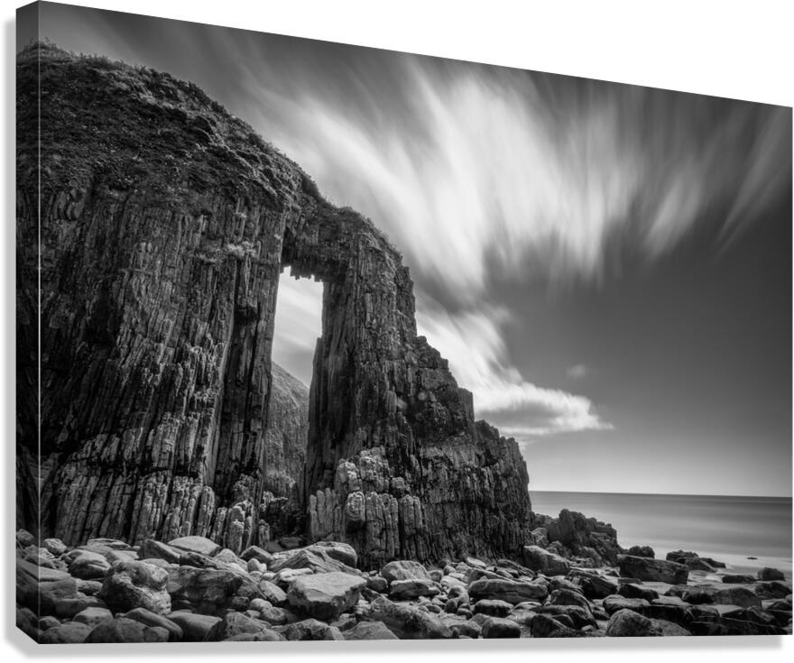 A monochrome long exposure photograph of Church Door Cove in Pembrokeshire South Wales capturing a magnificent towering cliff sculpted by the sea into a huge natural door. The dramatic scene includes clouds streaking overhead adding a sense of motion and ethereal beauty. Ideal for art lovers coastal enthusiasts and those looking to bring a touch of natures grandeur into their space.