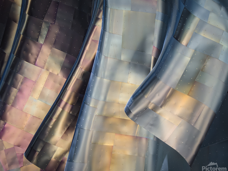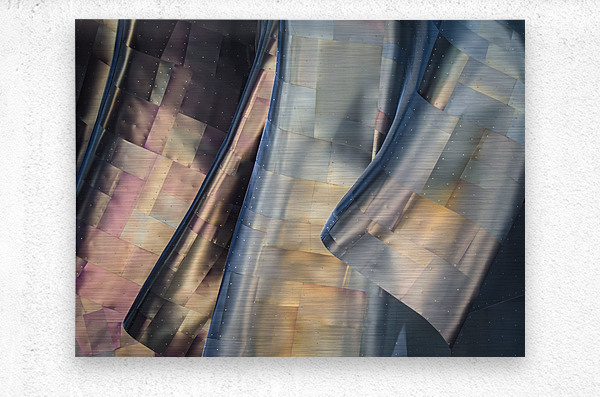 A striking photograph of the abstract metal panels on the exterior of Seattles Museum of Pop Culture. The image captures the metallic colors gleaming ...[+]