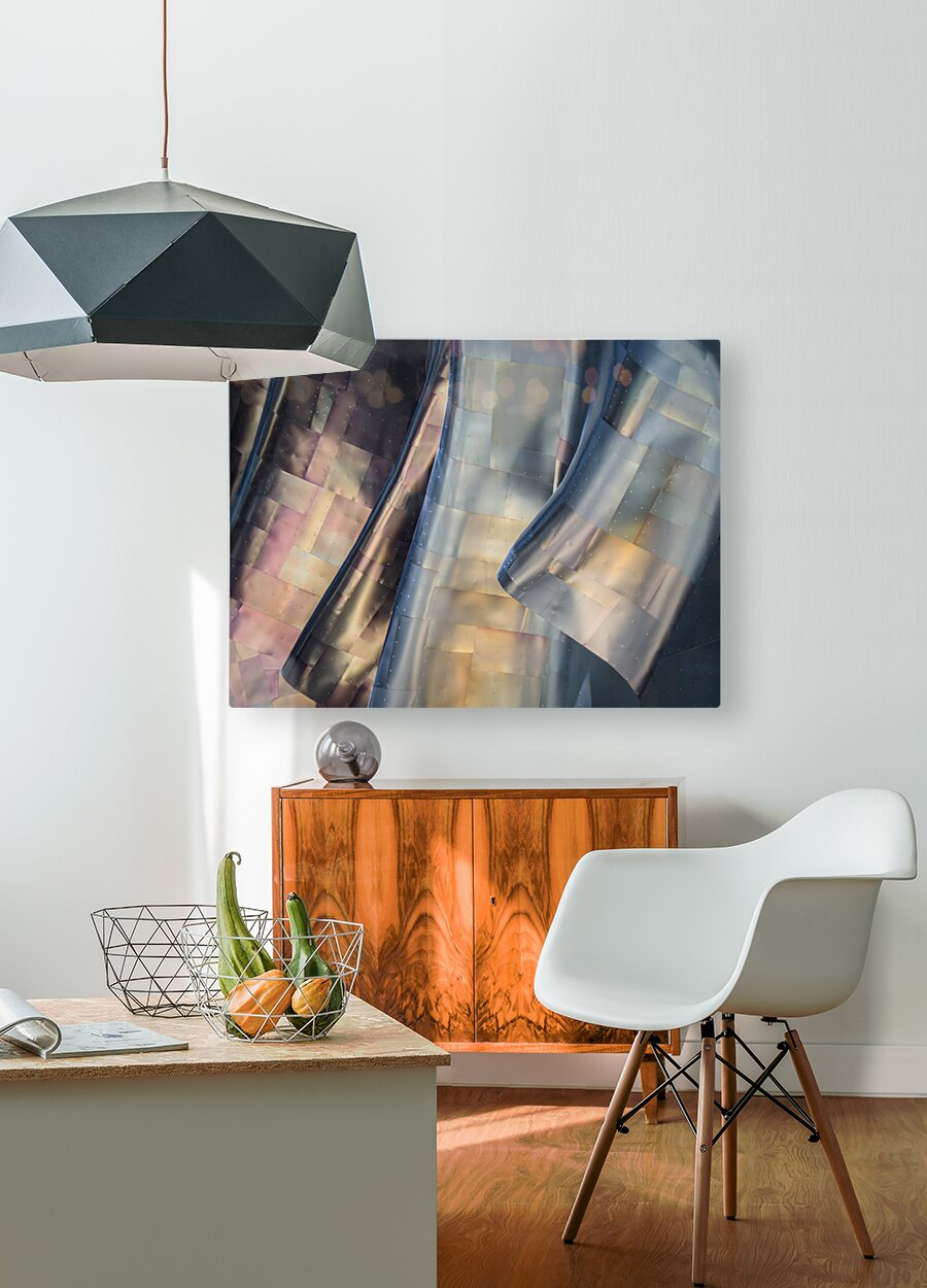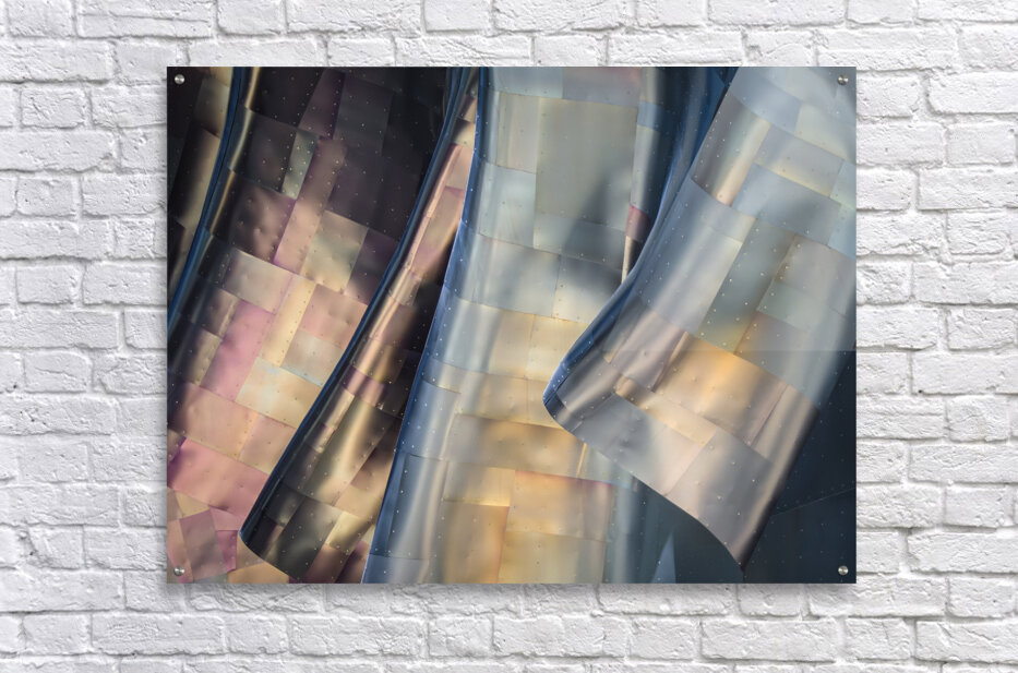 A striking photograph of the abstract metal panels on the exterior of Seattles Museum of Pop Culture. The image captures the metallic colors gleaming in the light showcasing the unique architectural design. Located in Washington USA this photograph highlights the interplay of light and metal creating a visually captivating scene. Ideal for architecture enthusiasts art collectors and those with an appreciation for modern design.