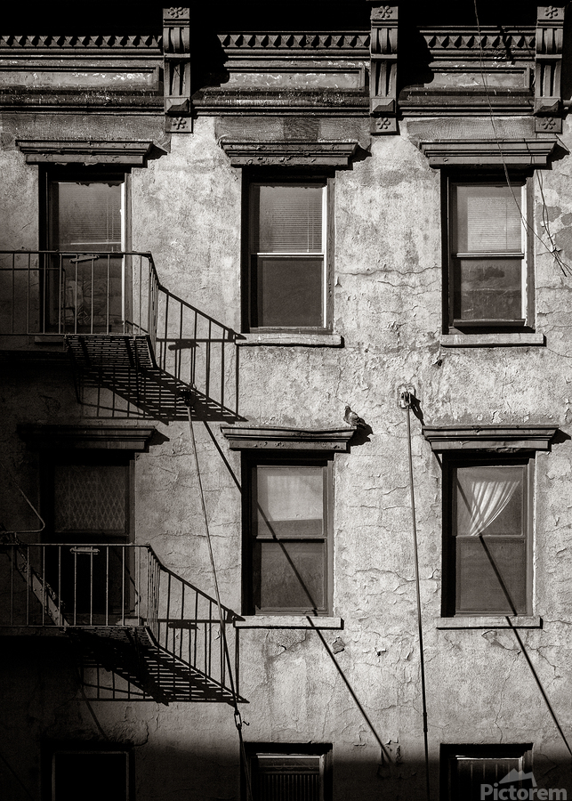 A monochrome photograph of a section of an old New York apartment block that shows signs of decay. The image captures peeling paint on the outer walls and a metal fire escape casting intricate shadows in the sunlight. A lone pigeon is perched on a ledge above one of the apartments adding a touch of life to the scene. Ideal for those interested in urban decay architectural photography or vintage New York imagery.
