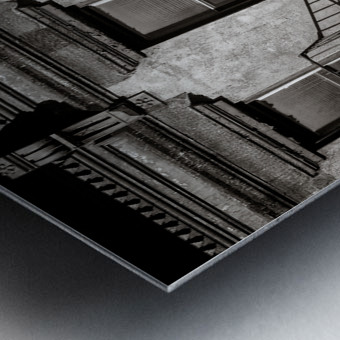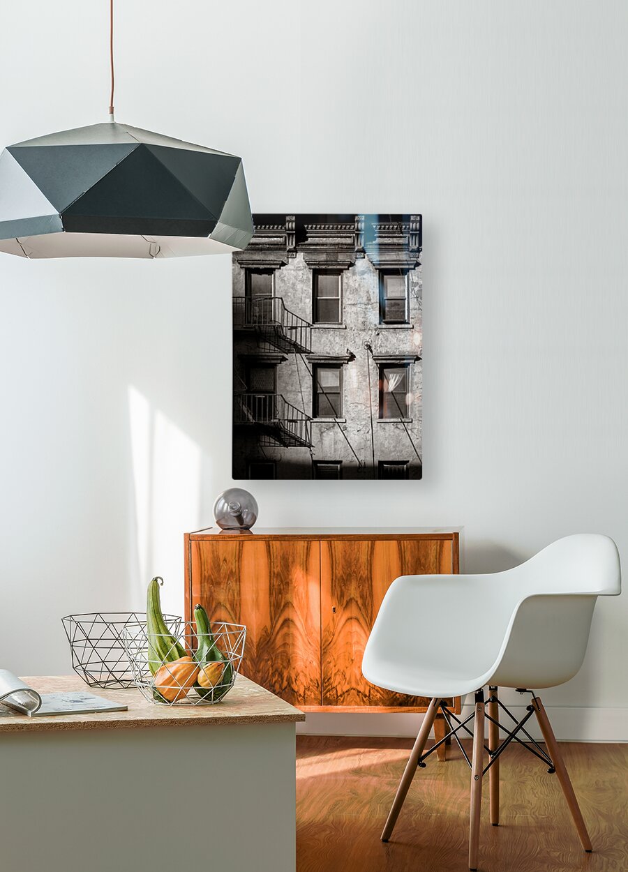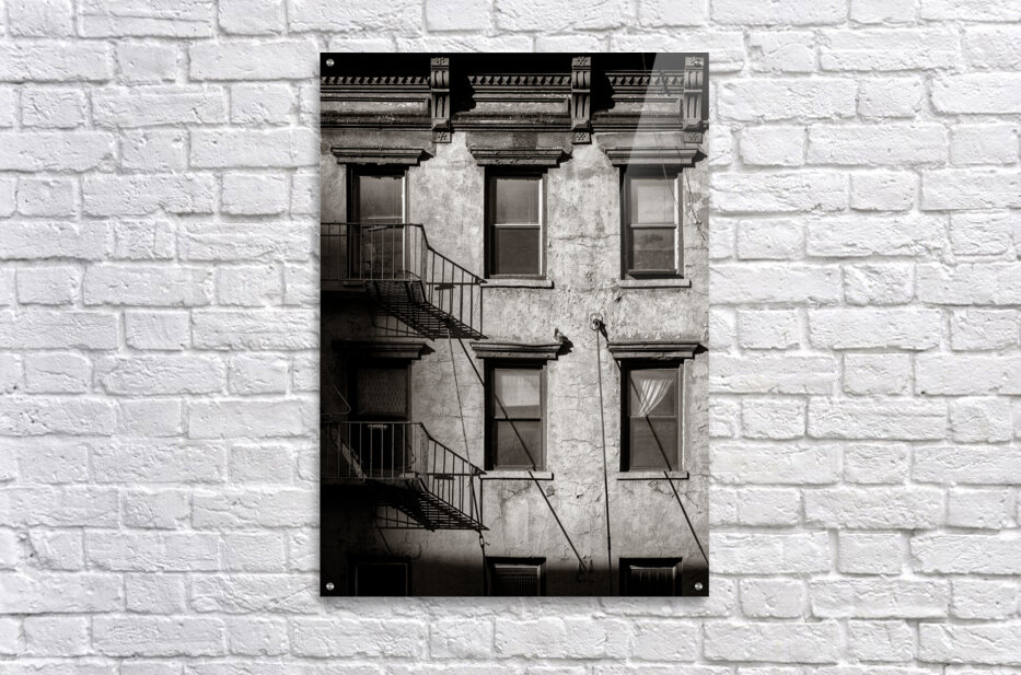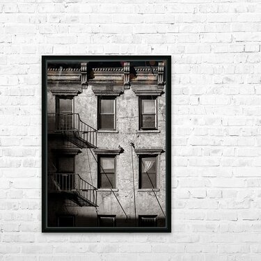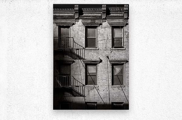 A monochrome photograph of a section of an old New York apartment block that shows signs of decay. The image captures peeling paint on the outer walls...[+]