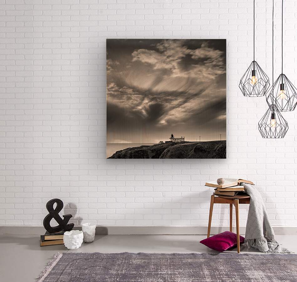 A monochrome photograph capturing dramatic clouds illuminated by early morning sunlight over Tod Head Lighthouse in Aberdeenshire Scotland. The play o...[+]