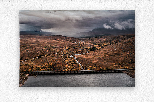 A dramatic view over Loch Cluanie dam as heavy rain clouds loom in the distance capturing the raw beauty of Glen Shiel in the Scottish Highlands Scotland. The photograph highlights the rugged landscape and atmospheric weather of this iconic region. Ideal for nature enthusiasts and those who appreciate the majestic scenery of Scotland.