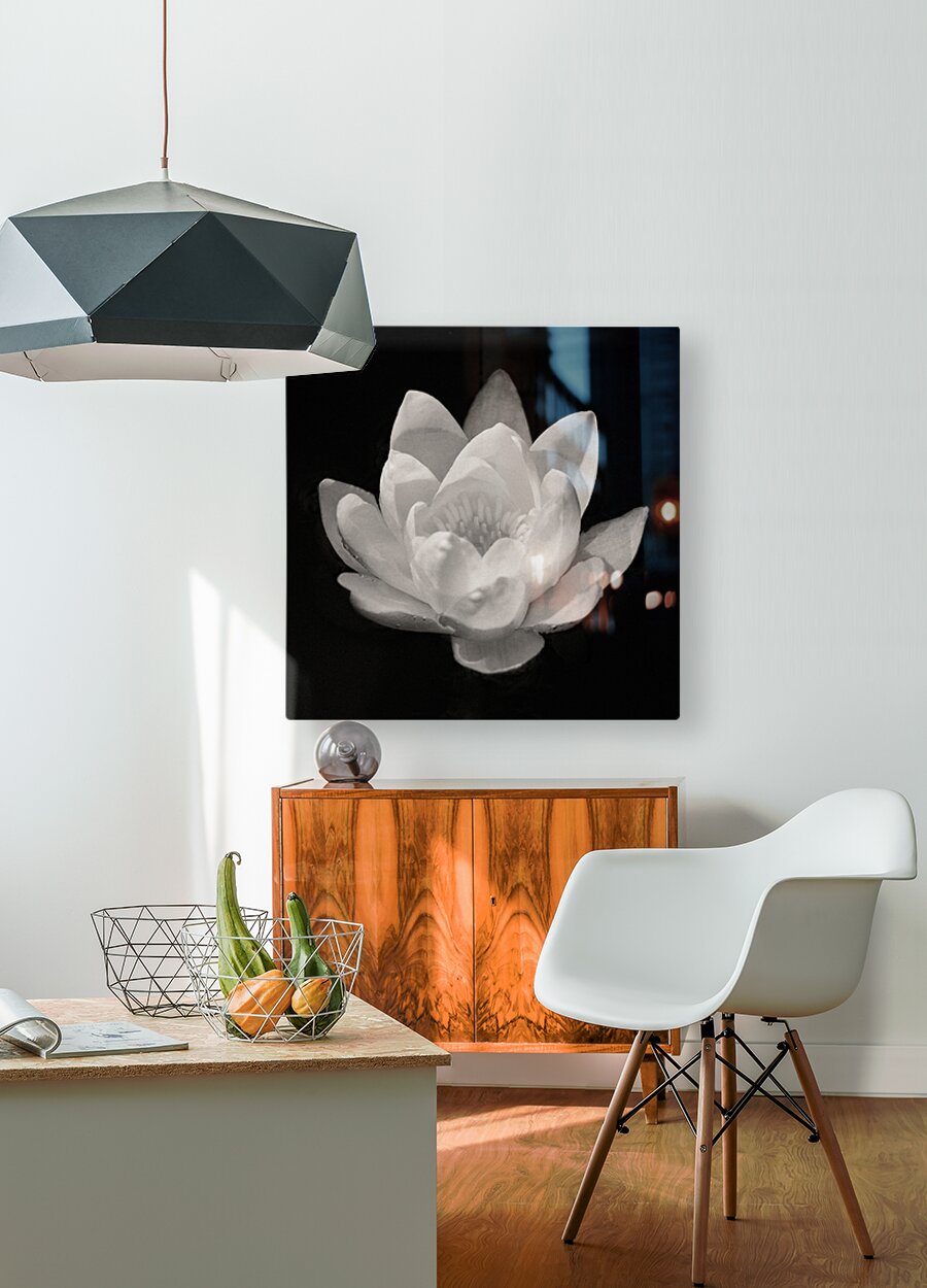 A rustic monochrome still-life study of a white water lily against a black background. The detailed texture and delicate petals of the lily stand out starkly in this high-contrast composition capturing the timeless beauty of nature in black and white. Ideal for minimalist decor art enthusiasts or as a serene addition to any living space.