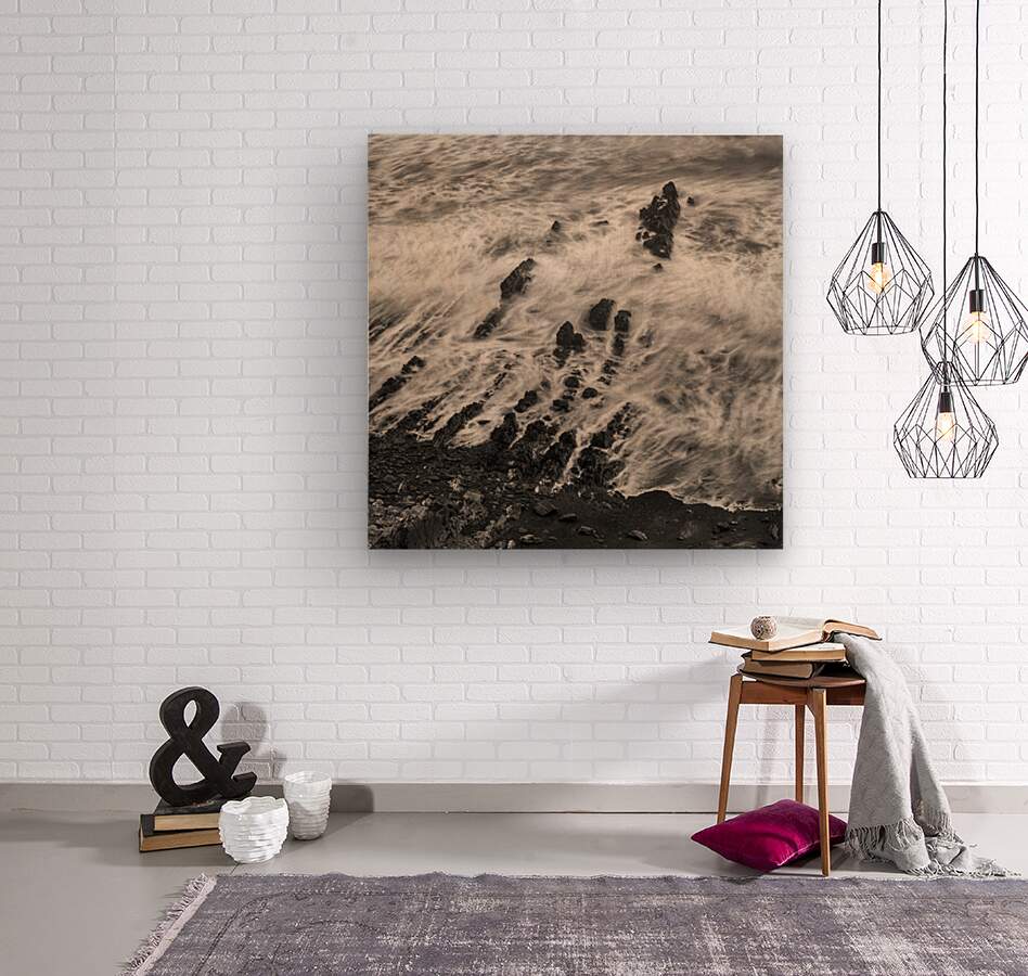 A semi-abstract monochrome study capturing the dynamic breaking waves and sea surf against Sandymouths rugged shoreline on a stormy day in Cornwall England. This black-and-white photograph emphasizes the dramatic contrast between the tumultuous ocean and the textured coastline highlighting the raw power and beauty of nature. Ideal for coastal enthusiasts nature lovers and those who appreciate minimalist fine art photography.
