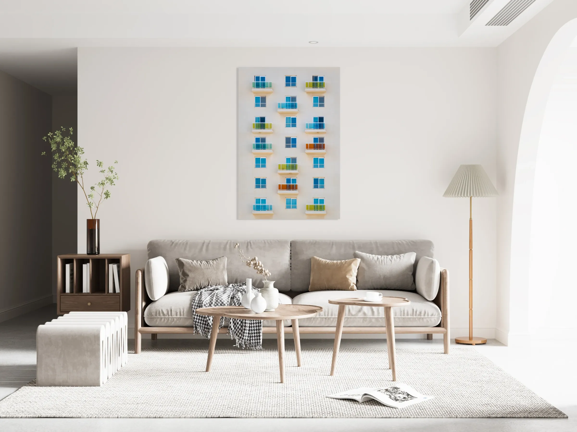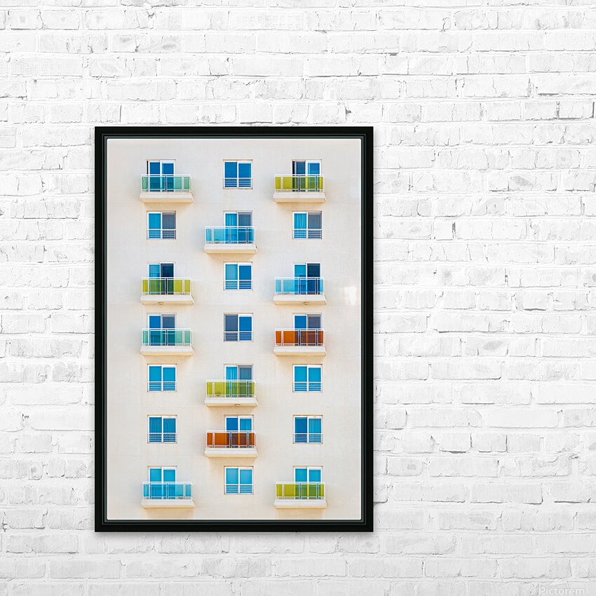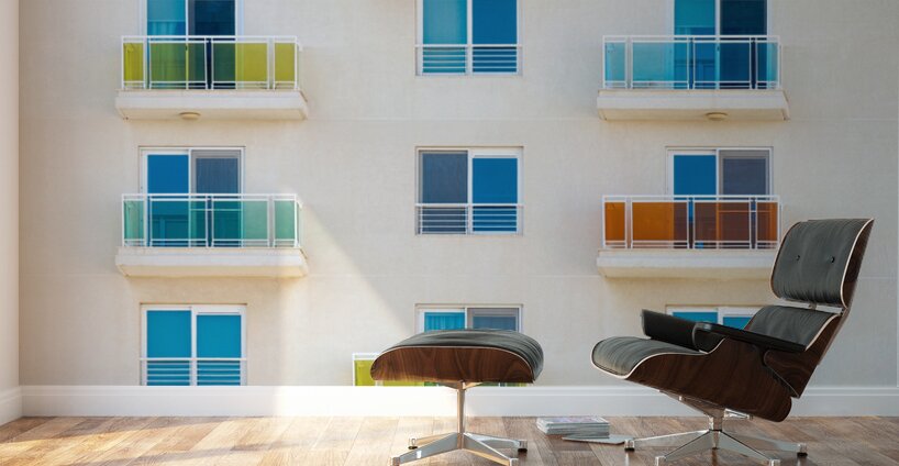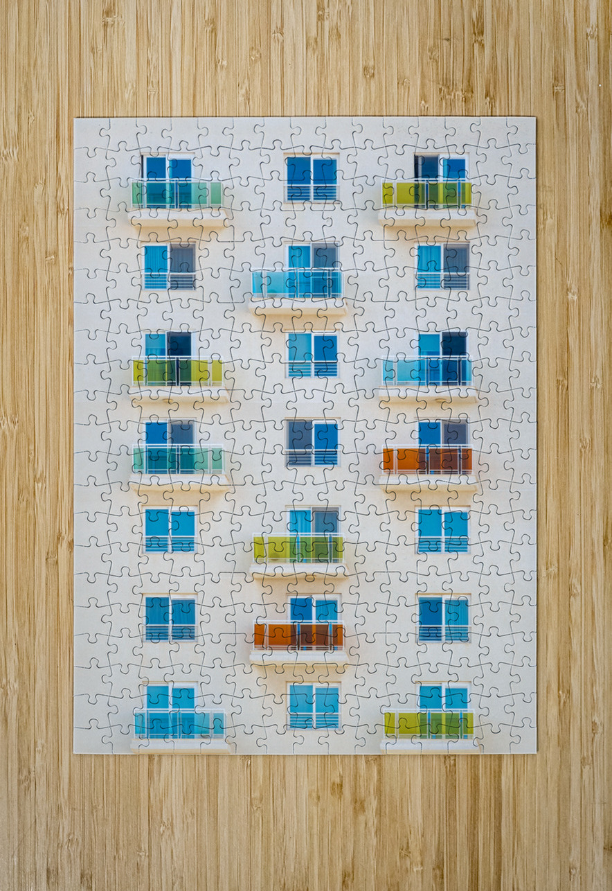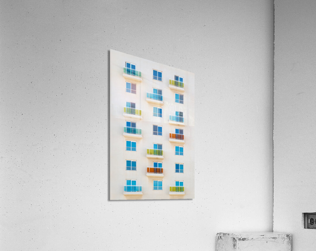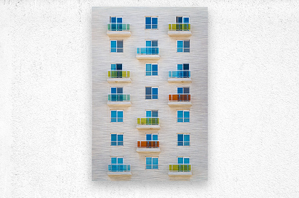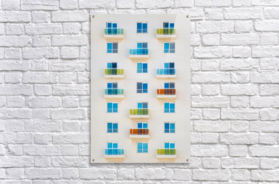 A photograph of an apartment complex in Sliema Malta showcasing a precise grid of balconies with glass railings in vibrant shades of blue yellow and orange. This semi-abstract image highlights urban symmetry and color dynamics. Perfect for art enthusiasts and interior decorators looking to add a modern touch to their space.