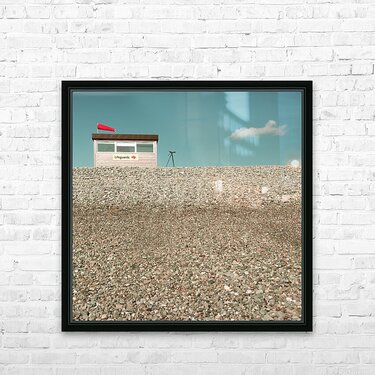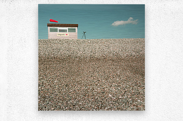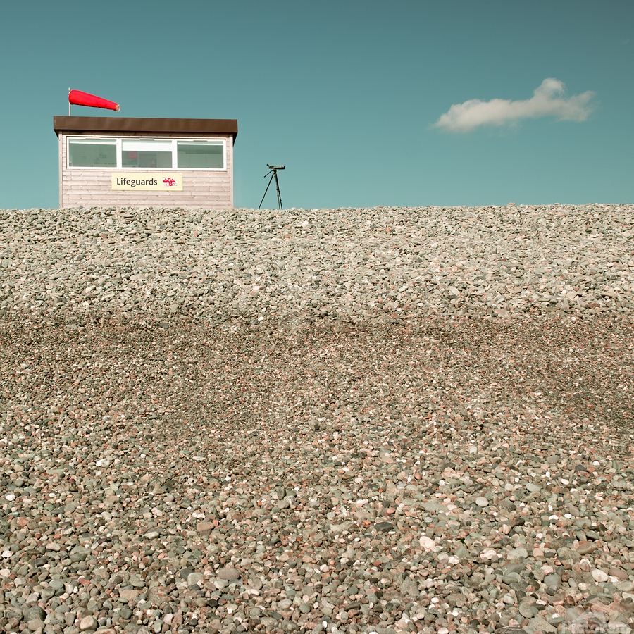 A lifeguard hut stands on a pebbled beach with a telescope positioned outside. In the blue sky a solitary cloud subtly resembles the form of a swimmer...[+]