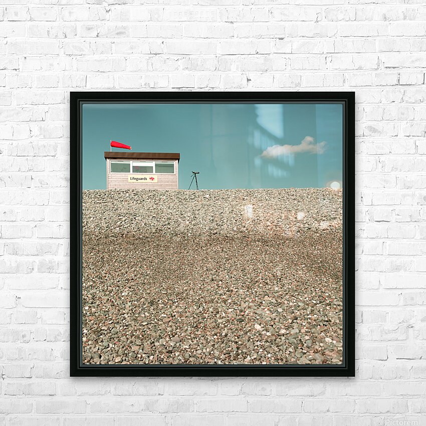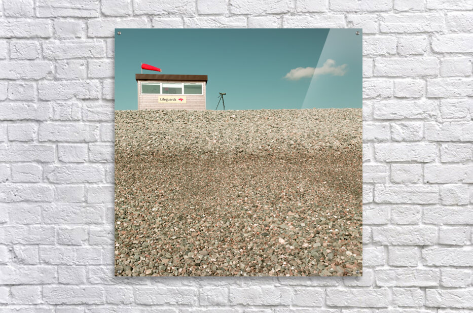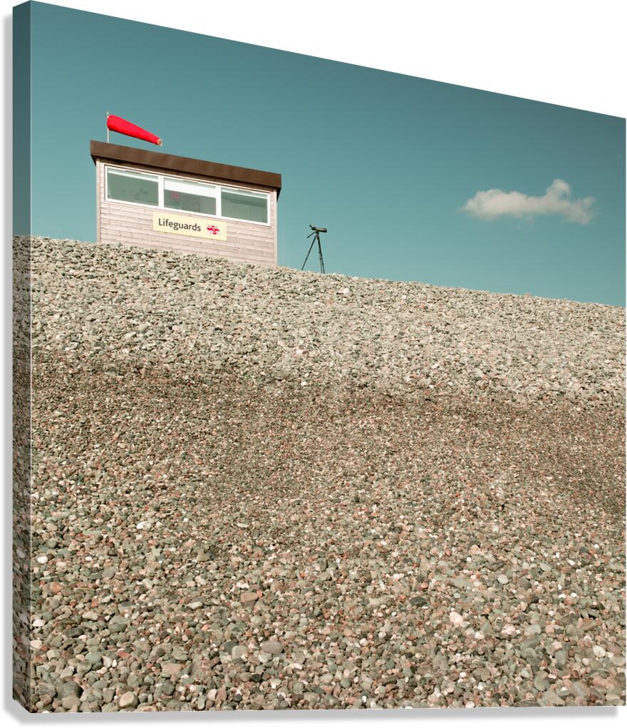 A lifeguard hut stands on a pebbled beach with a telescope positioned outside. In the blue sky a solitary cloud subtly resembles the form of a swimmer adding a humorous touch. The telescope is pointed towards the cloud creating an intriguing juxtaposition of elements. Ideal for beach enthusiasts coastal decor or adding a whimsical touch to a space.