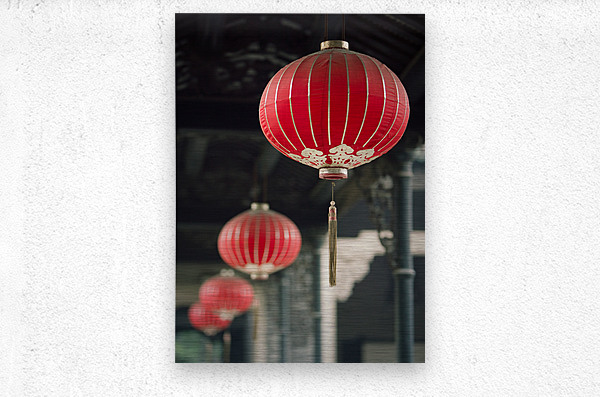 A vibrant photograph of four red Chinese lanterns hanging inside a temple in Guangzhou China. This image captures the essence of traditional Chinese culture with its striking red lanterns set against the serene temple backdrop. Perfect for travel photography enthusiasts and for adding an authentic touch of Chinese heritage to any decor.