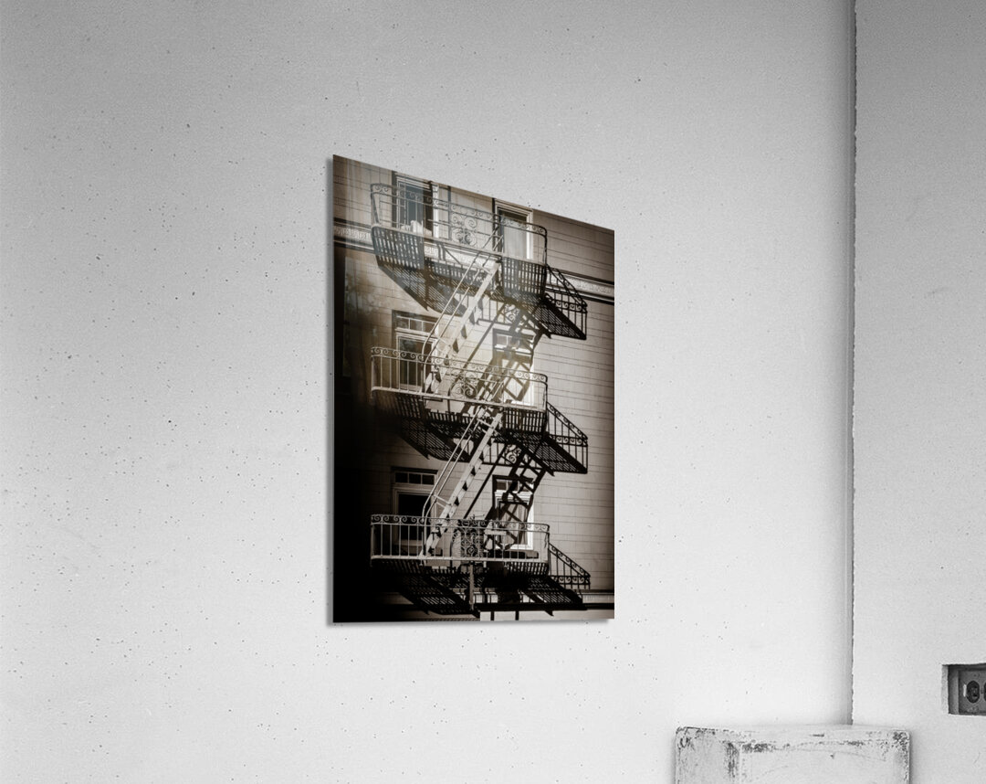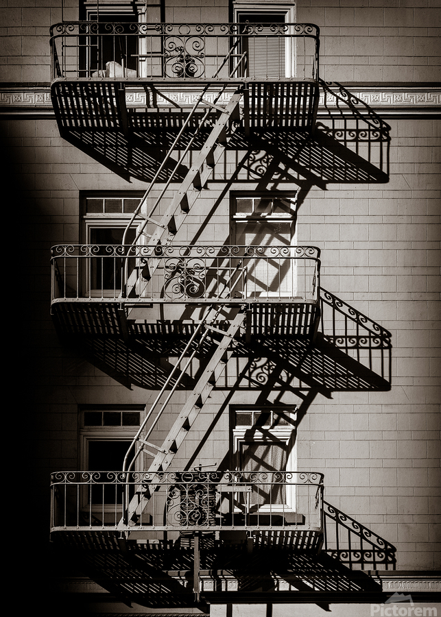 A monochrome image of a vintage fire escape casting dramatic evening shadows along the side of a San Francisco apartment block. The photograph capture...[+]