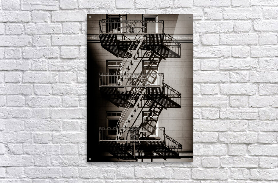 A monochrome image of a vintage fire escape casting dramatic evening shadows along the side of a San Francisco apartment block. The photograph captures the intricate metalwork of the fire escape and the play of light and shadow on the buildings facade creating a striking visual contrast. This black-and-white photo highlights the architectural details and the urban atmosphere of San Franciscos historic neighborhoods. Perfect for lovers of urban photography architectural enthusiasts or those seeking a unique piece of art for their home or office.