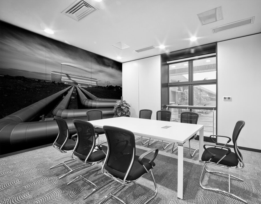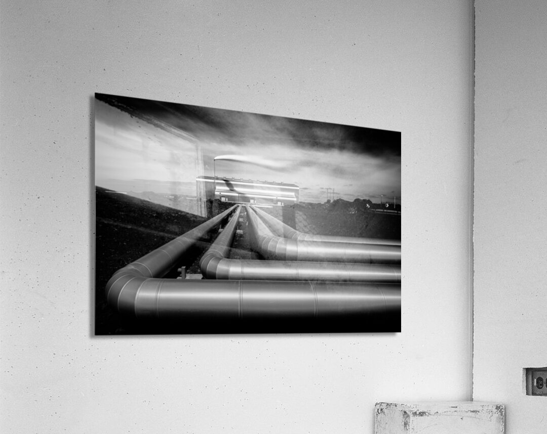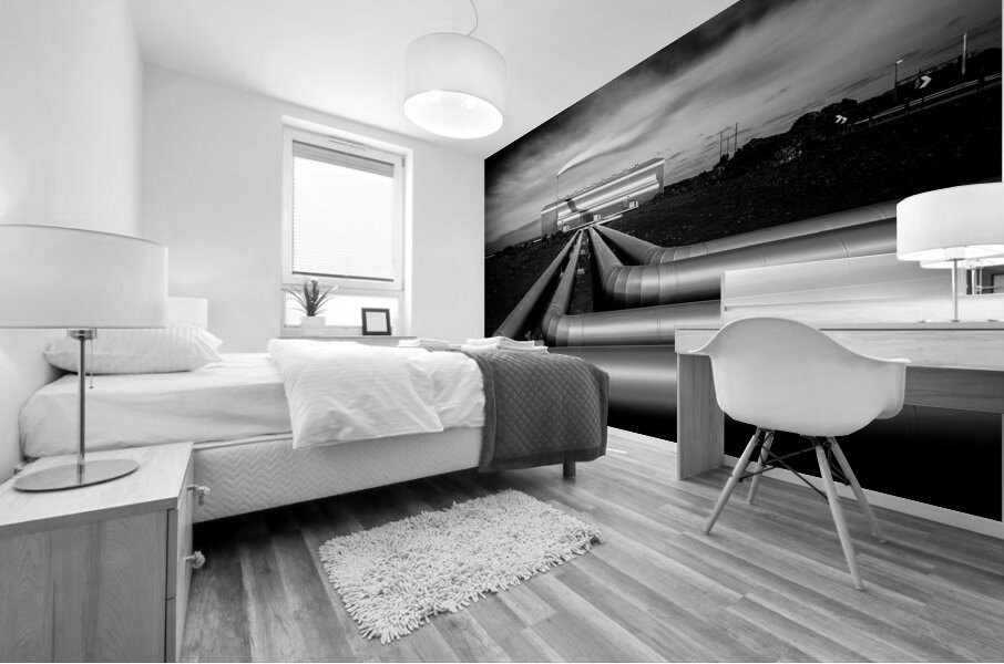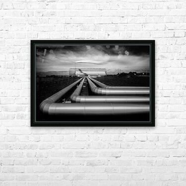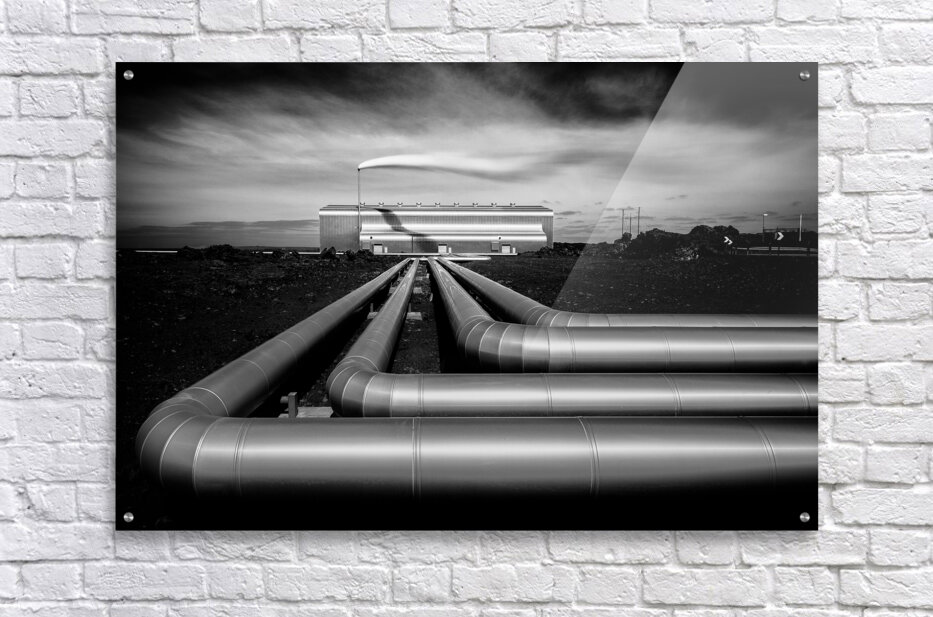 A monochrome long exposure image of the Reykjanesvirkjun geothermal power plant in Iceland. This photograph highlights the silver pipes extending towa...[+]