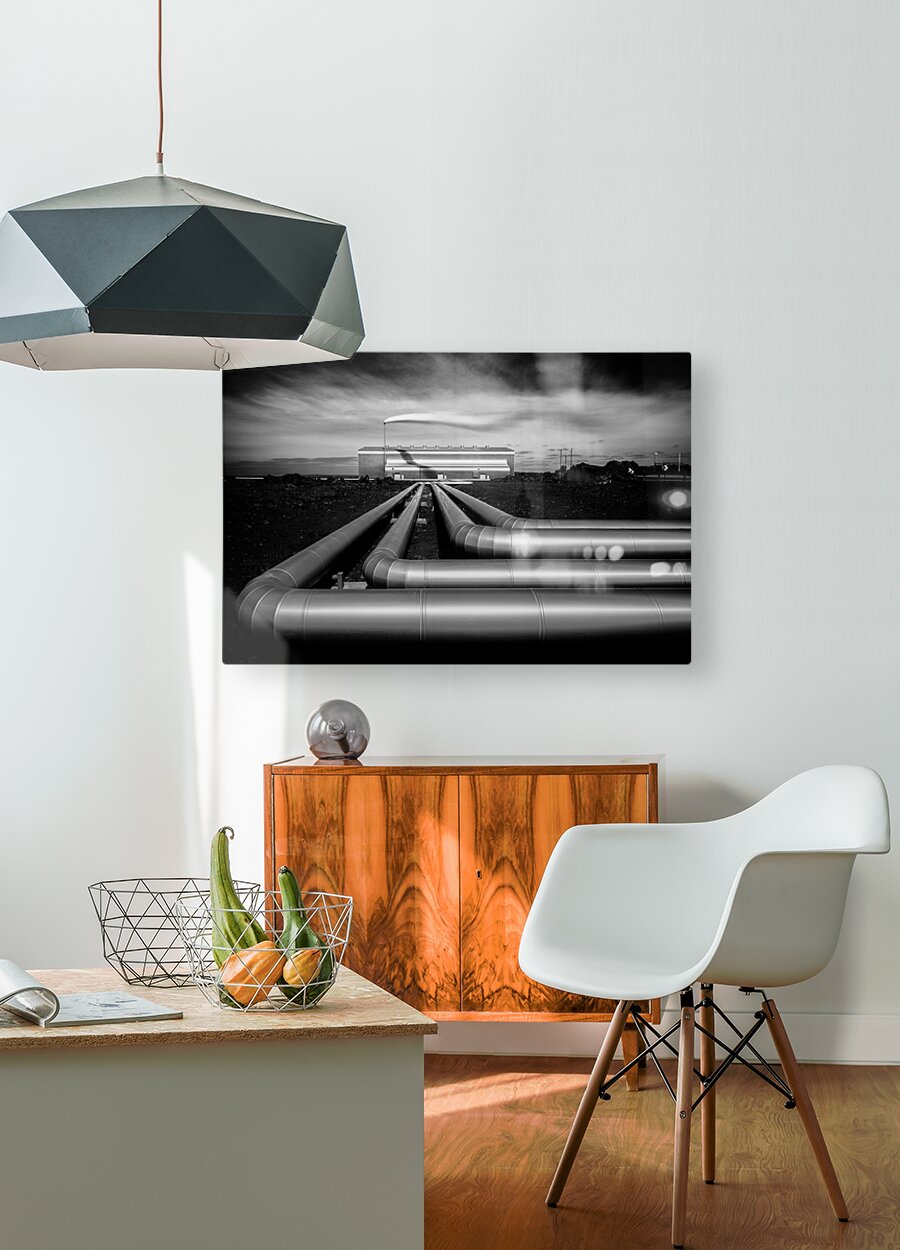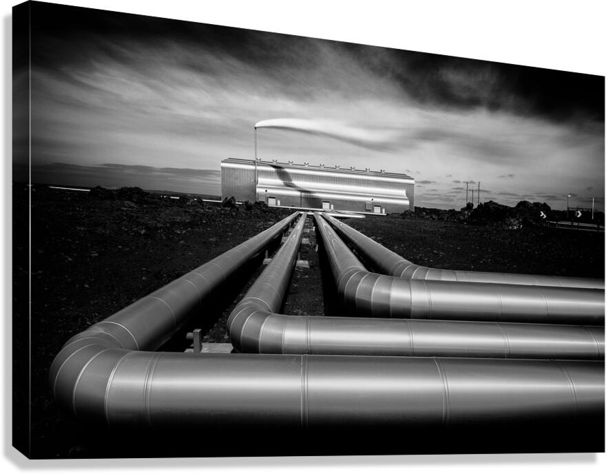 A monochrome long exposure image of the Reykjanesvirkjun geothermal power plant in Iceland. This photograph highlights the silver pipes extending towards the distant power plant with steam dramatically rising from the plants chimney. The long exposure technique adds a smooth ethereal quality to the steam and sky enhancing the stark contrast of the industrial landscape against the natural surroundings. Ideal for those interested in industrial landscapes geothermal energy and Icelandic scenery.