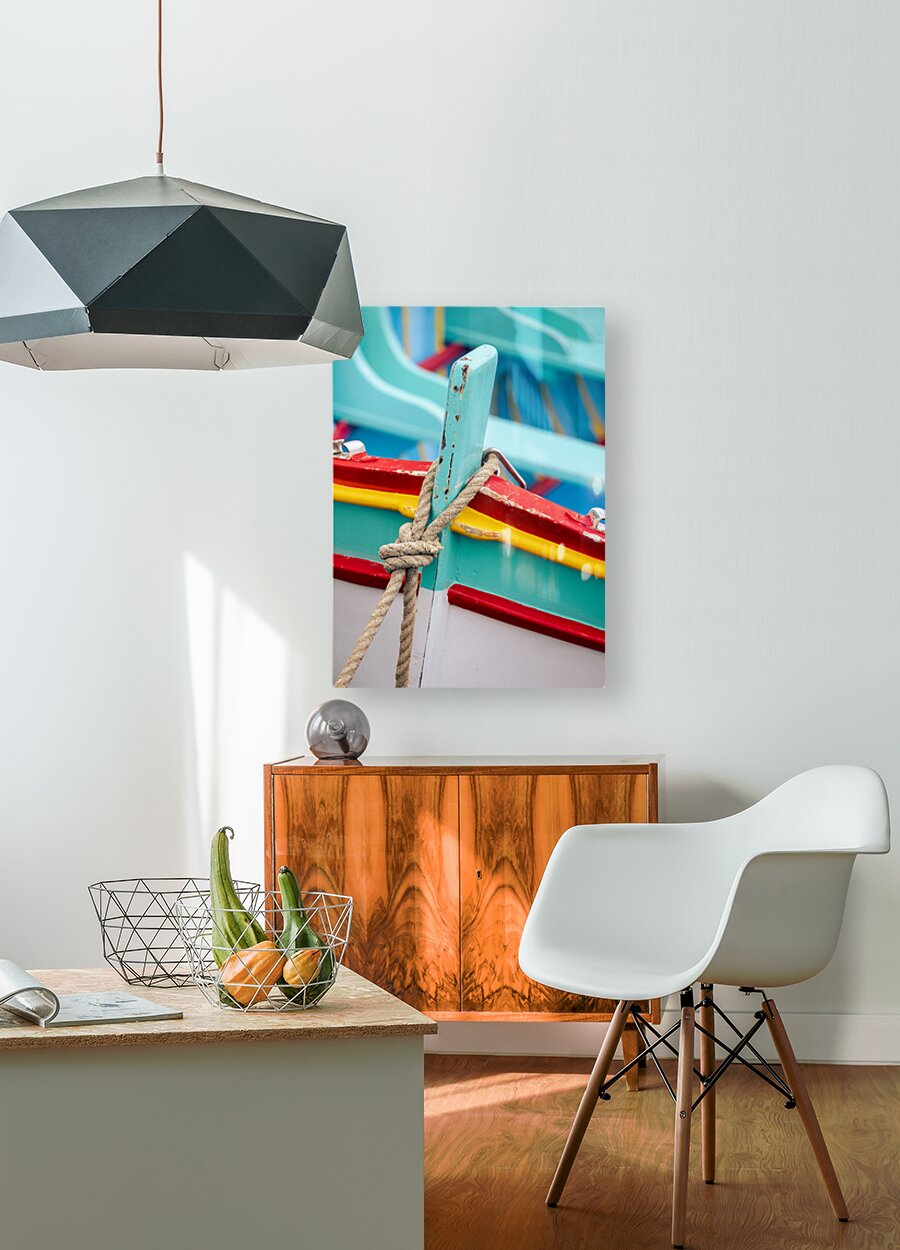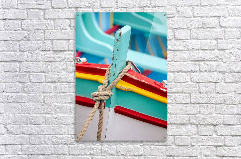 A close-up of the vibrant details of a Maltese luzzu fishing boat in the traditional fishing village of Marsaxlokk. The photograph captures the intricate craftsmanship focusing on a weathered rope tied to a cleat on the bow highlighting the boats colorful patterns and rich textures. Perfect for those interested in maritime heritage traditional boats and the cultural essence of Malta.