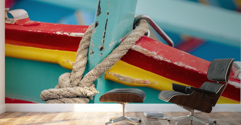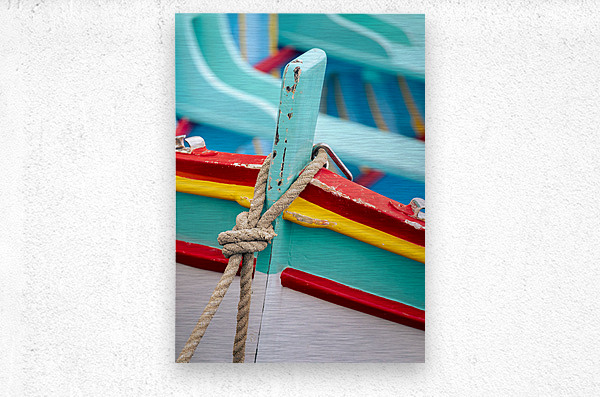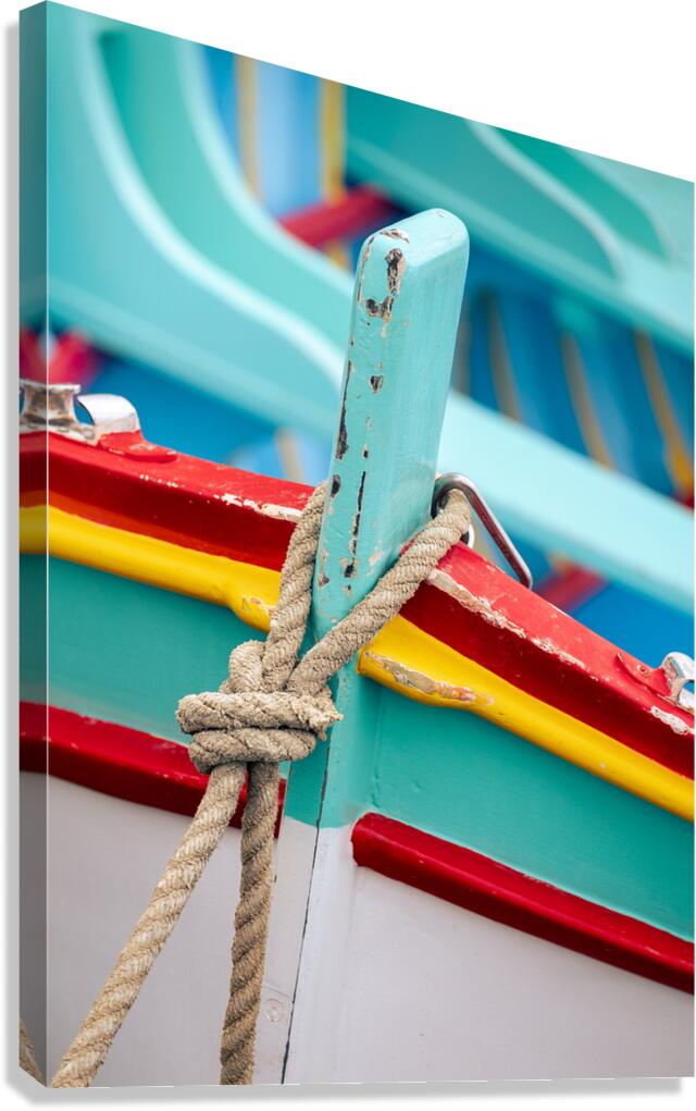 A close-up of the vibrant details of a Maltese luzzu fishing boat in the traditional fishing village of Marsaxlokk. The photograph captures the intricate craftsmanship focusing on a weathered rope tied to a cleat on the bow highlighting the boats colorful patterns and rich textures. Perfect for those interested in maritime heritage traditional boats and the cultural essence of Malta.