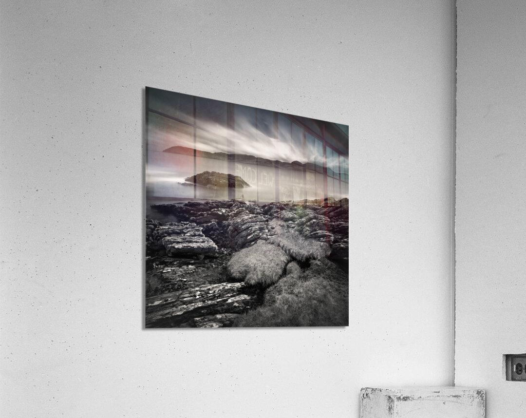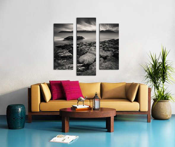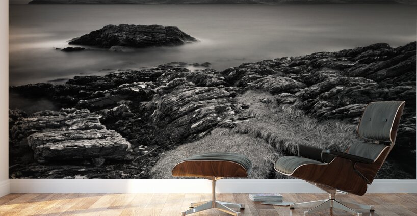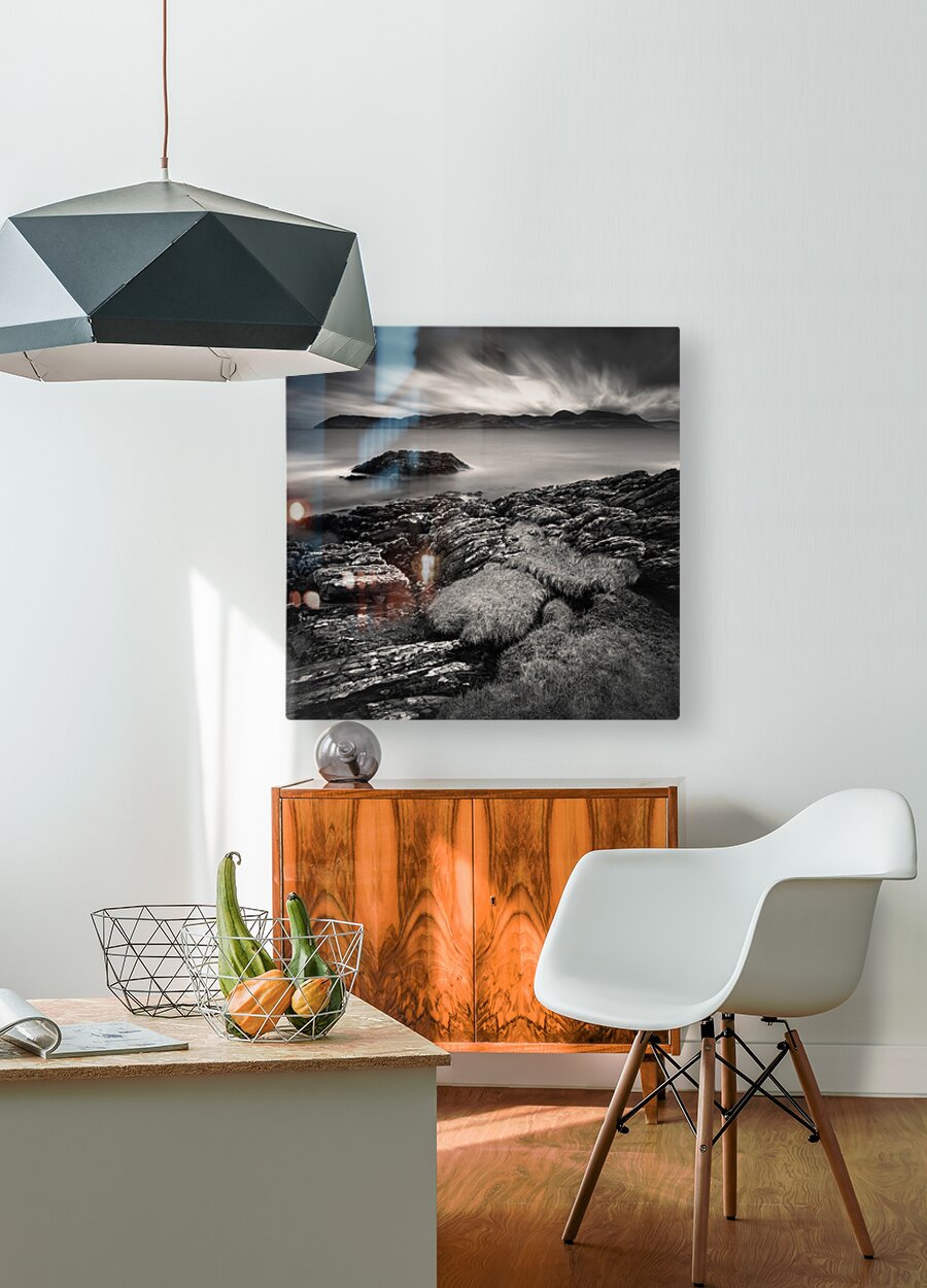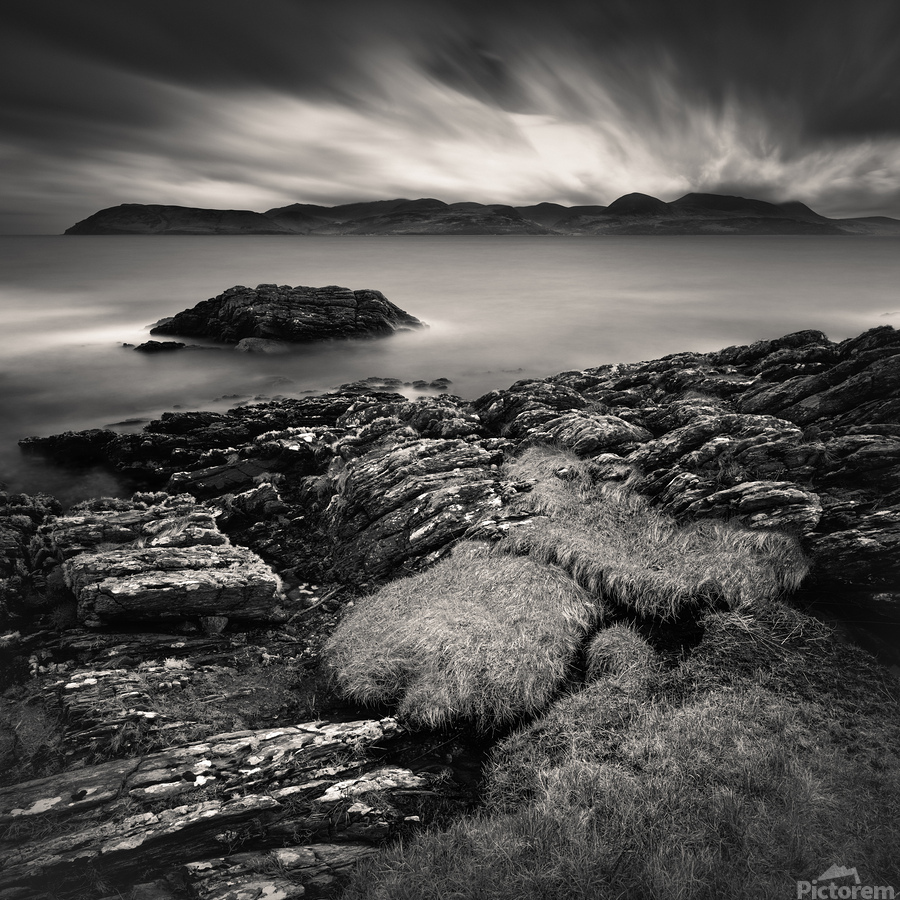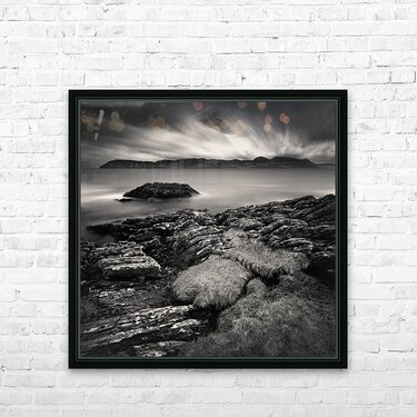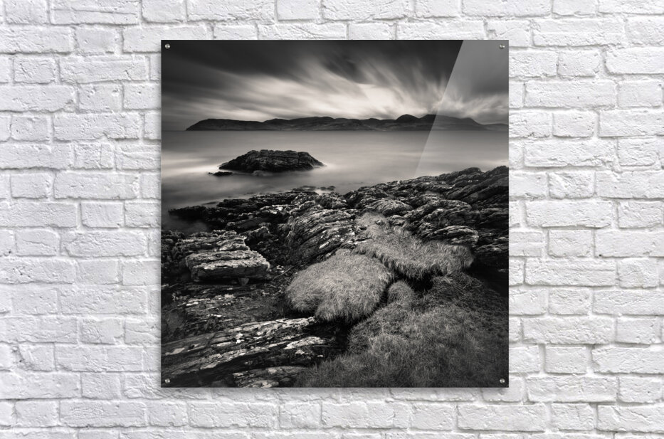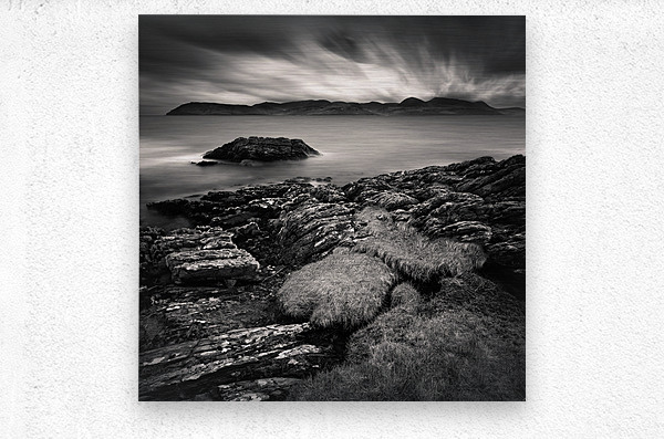 The view across to the Isle of Arran from the Kintyre peninsula is captured in timeless monochrome, with the calm waters of the Firth of Clyde stretching out beneath a brooding sky. The island rises in the distance as a dark, rugged silhouette, while the long exposure lends the water a soft stillness that contrasts with the drama above. Arran, often called “Scotland in miniature” for its varied landscapes, lies just twelve miles from the mainland and has long inspired artists, walkers, and travellers. Seen from the Kintyre side, the island takes on a striking presence, its outline standing bold against the ever-changing coastal skies. This image is perfect for anyone drawn to the quiet power of coastal landscapes or the classic mood of black and white photography. It is available as wall art and across a wide range of formats to suit your space or style.