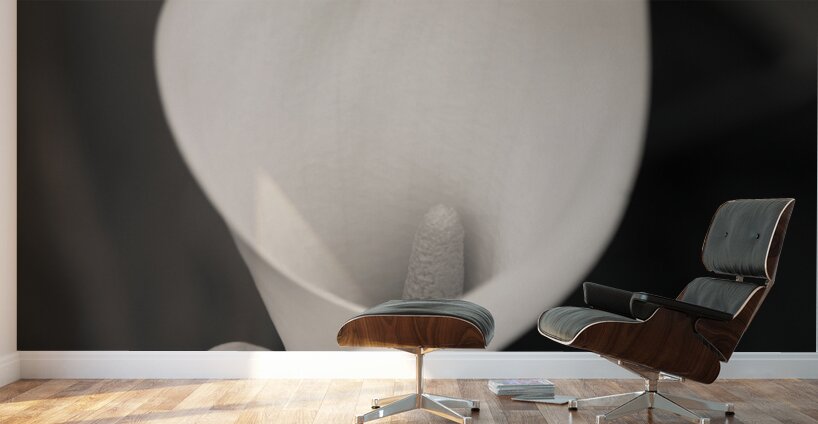 A monochrome photograph of a delicate calla lily highlighting the elegant curves and smooth lines of its form. The subtle interplay of light and shadow creates depth and texture within the petals offering a contemplative view of natures beauty. Ideal for minimalist decor nature enthusiasts or for those seeking refined botanical art