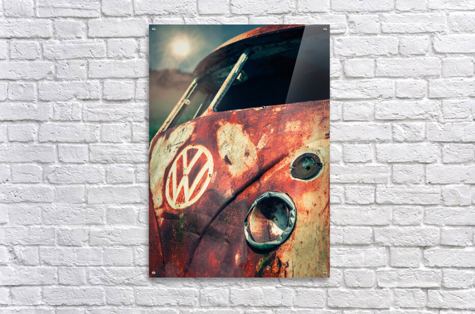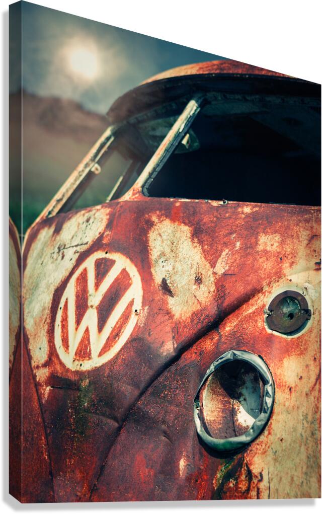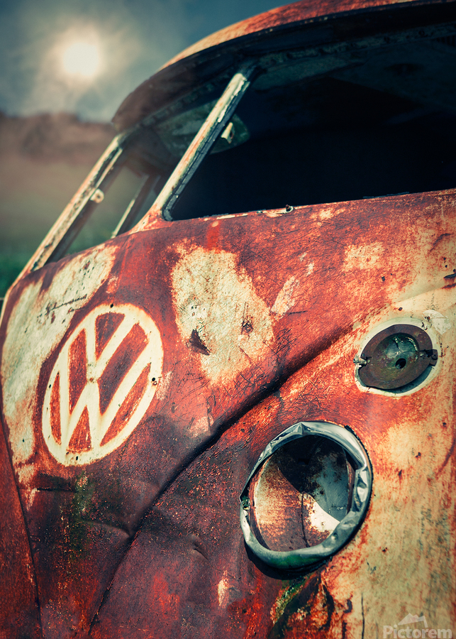 A weathered and rusted VW split-screen camper van sits abandoned and derelict in the Cameron Highlands Malaysia. This vintage vehicle with its front view captured in a state of disrepair highlights the intricate details of its decaying paintwork and nostalgic design. Ideal for those seeking evocative images of classic cars urban decay or vintage automotive history.