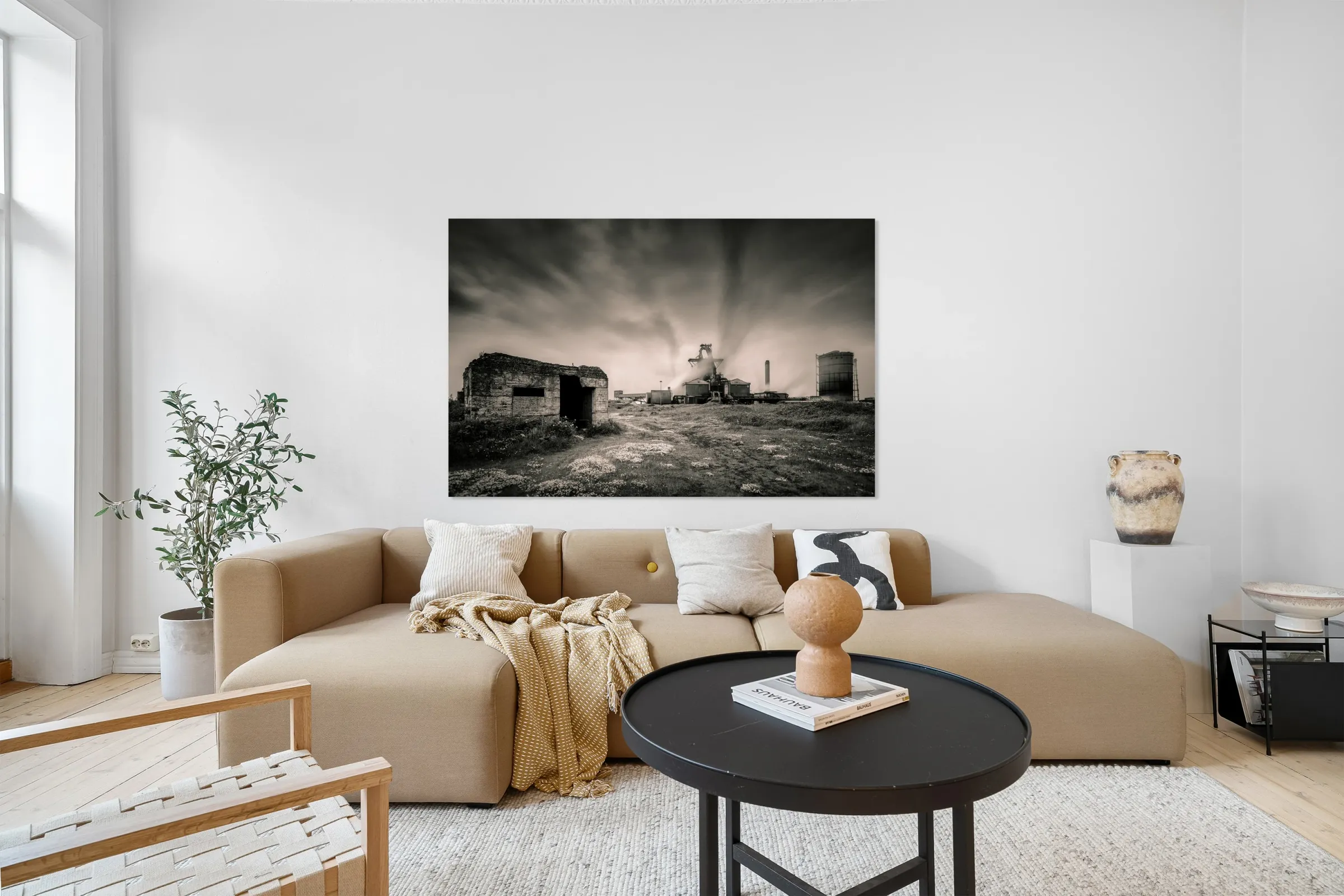 A monochrome, sepia, long exposure photograph of Teeside Steelworks in Redcar, UK, capturing the dramatic steam rising from the plant. This atmospheri...[+]