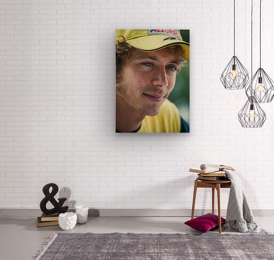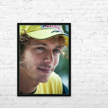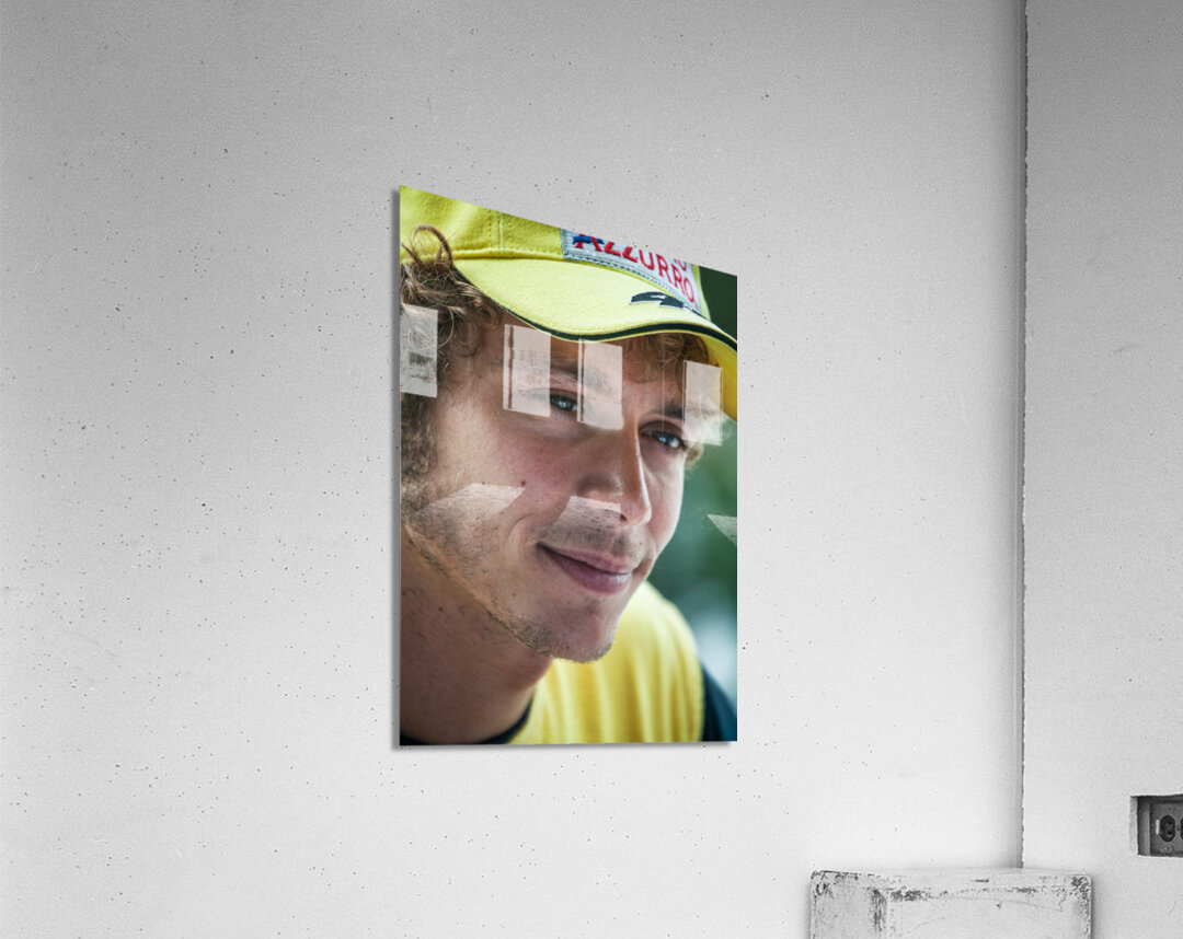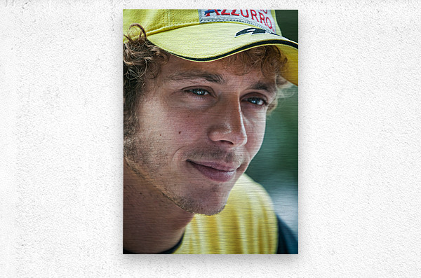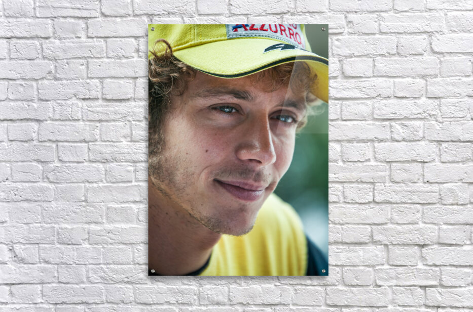A close-up portrait of Valentino Rossi smiling just before winning his 5th MotoGP World Championship marking his 7th world title overall at the Sepang International racing circuit Malaysia. A great photograph for MotoGP enthusiasts Valentino Rossi fans and motorsport memorabilia collectors.