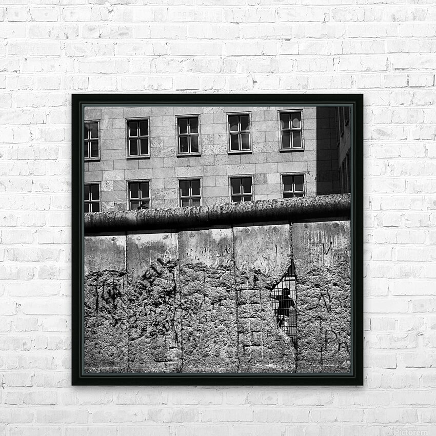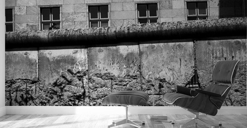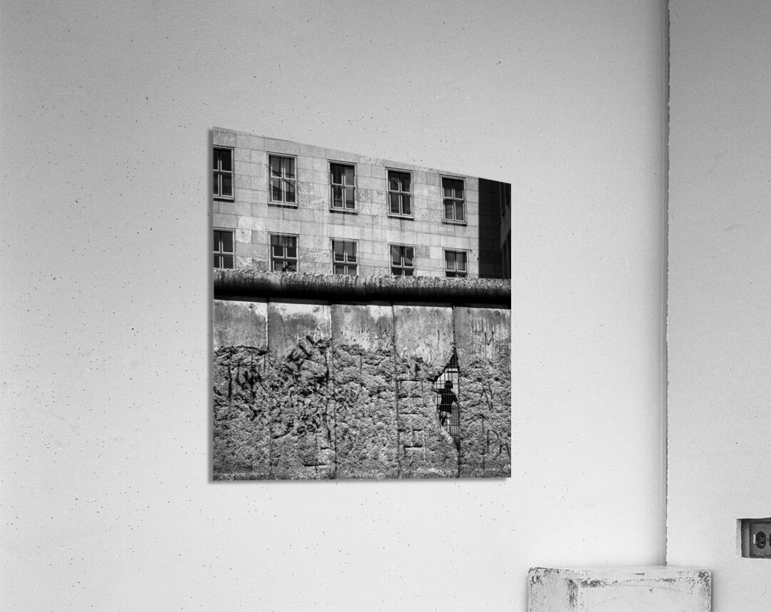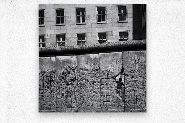 A monochrome photograph of a lone figure dancing captured through a hole in the remnants of the Berlin Wall in Berlin Germany. This striking black and white image highlights the contrast between the dancers movement and the historic crumbling structure of the wall. Ideal for history enthusiasts art collectors and anyone interested in evocative urban photography.